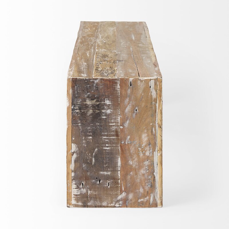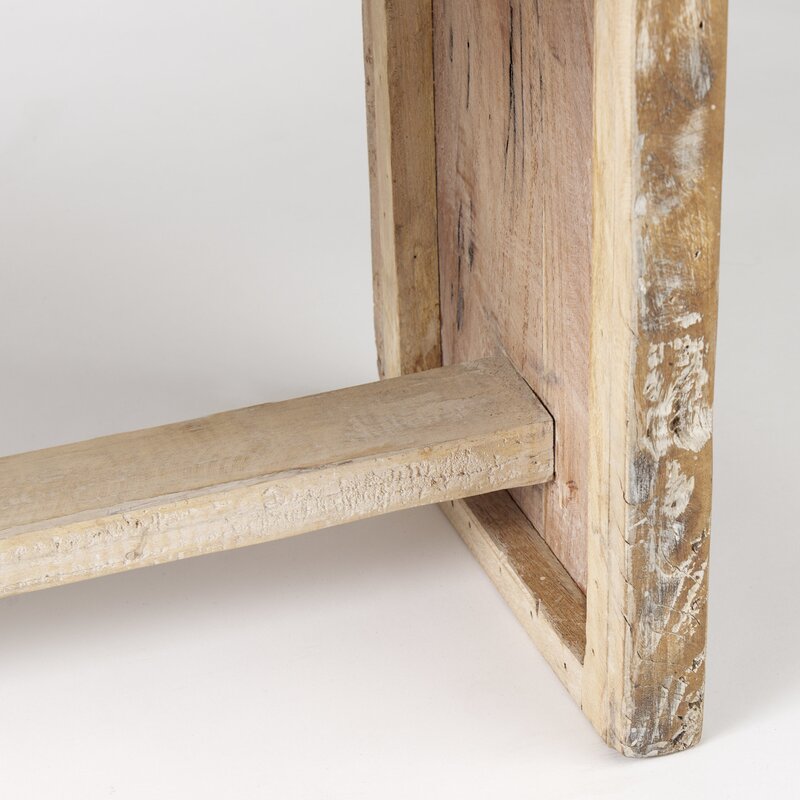 This bench has a rustic weathered look and infuses any space with character and warmth. It is crafted from solid wood and has a simple rectangular shape with a low beam at the base. It comfortably seats two to three people. The light brown finish has been purposefully distressed, complete with the wormholes and knots that give this piece a feeling of age. This bench measures 48†wide and 12†deep, so is a great choice for a hallway or narrow entryway. Best of all, it arrives at your door fully assembled.