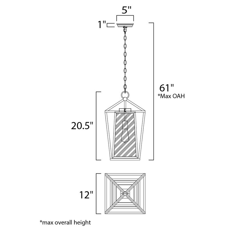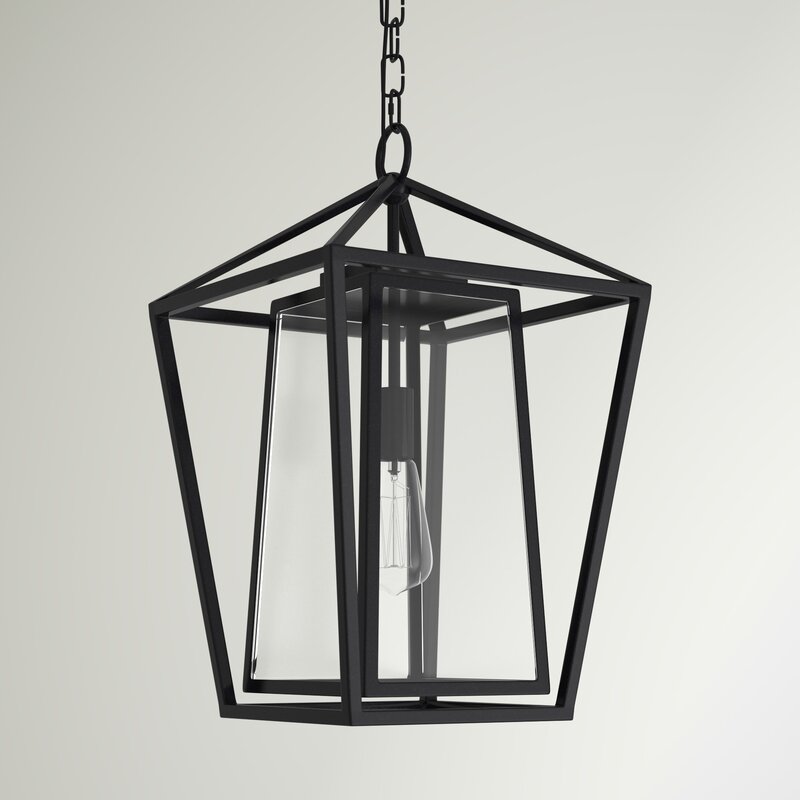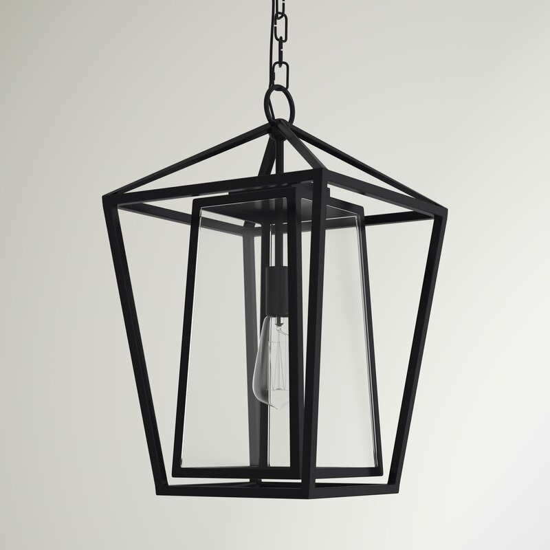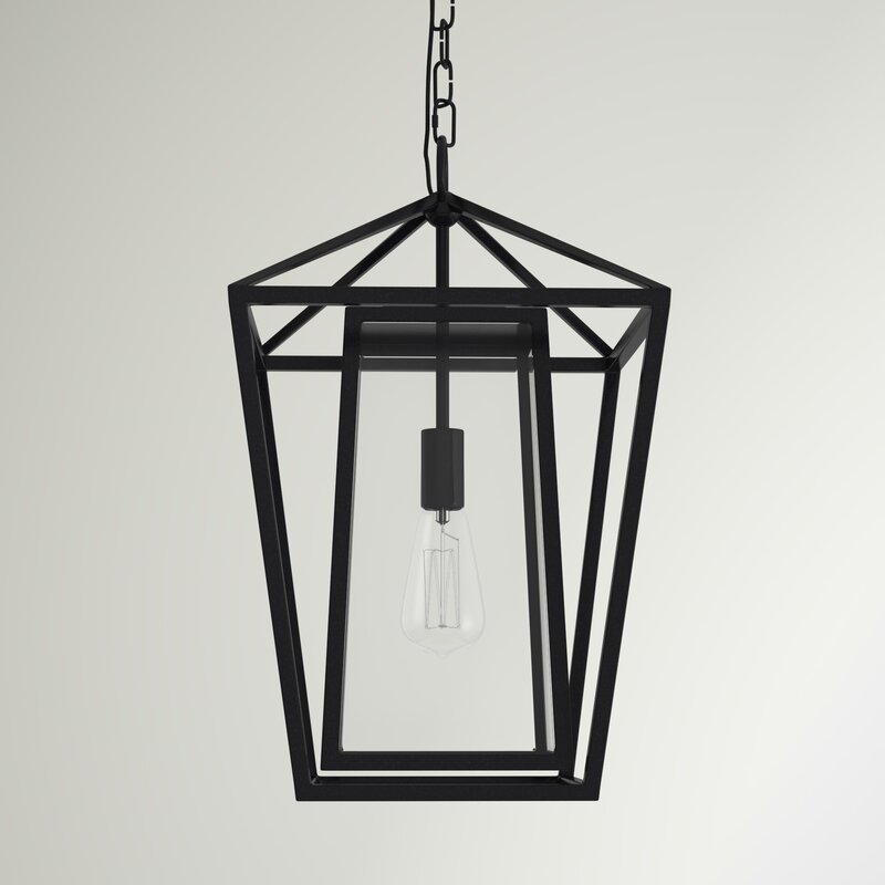 This Malia Black 1 -Bulb 20.5″ H Outdoor Hanging Lantern features a fresh take on the classic lantern shape. It’s made from metal in a black finish and has an open birdcage-shaped frame with geometric details at the top for the right amount of coastal farmhouse charm. Inside the frame, this fixture has a trapezoidal glass shade that surrounds a downward-facing medium-base bulb up to 60W (sold separately) that brightens up your front door or garage. We also love that this light is compatible with a sloped ceiling and a dimmer switch, so it helps you make the most out of your lighting. Best of all, this outdoor lantern is safe to install in locations where it gets direct exposure to water.