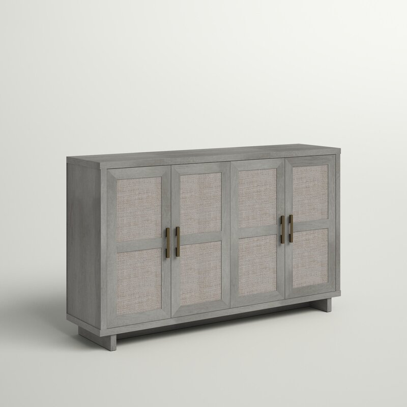 This versatile credenza features a spacious design that’s just right as a buffet in your dining room or a TV stand in the living room. The clean-lined frame is made from solid and engineered wood with a weathered finish that complements your coastal farmhouse decor. Two sets of double cabinet doors feature linen panels for a breezy look and feel, while adjustable shelf space behind them accommodates dishes, media items, and towels. We love how the gold metal handles add textural contrast to the finish. Plus, this credenza has a wide surface for appetizer trays and a table lamp.