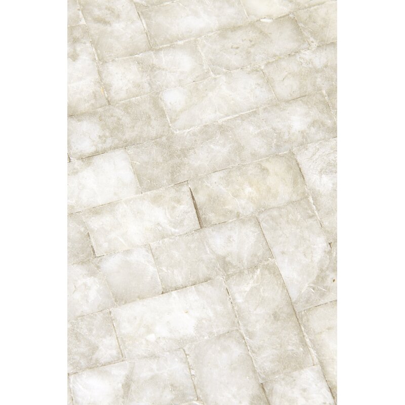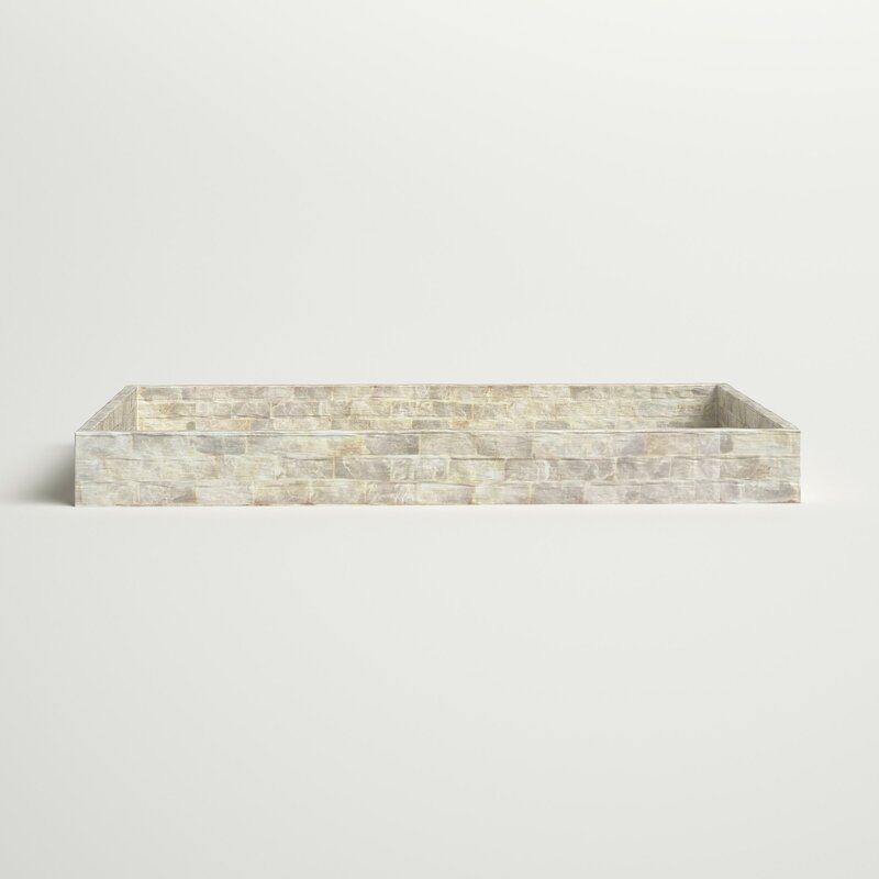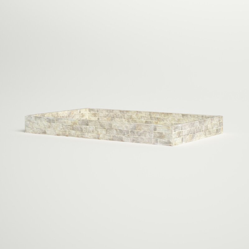 I love this tray and it was exactly what I wanted! Beautiful pearlescent finish because it’s made from natural capiz shells.Iridescent and luminous is how I would describe the finish.It is a top quality piece that looks very expensive in person.My pictures are not doing justice to this tray.My oversized coffee table books are not crowded and there is room left over for styling.Very sturdy.