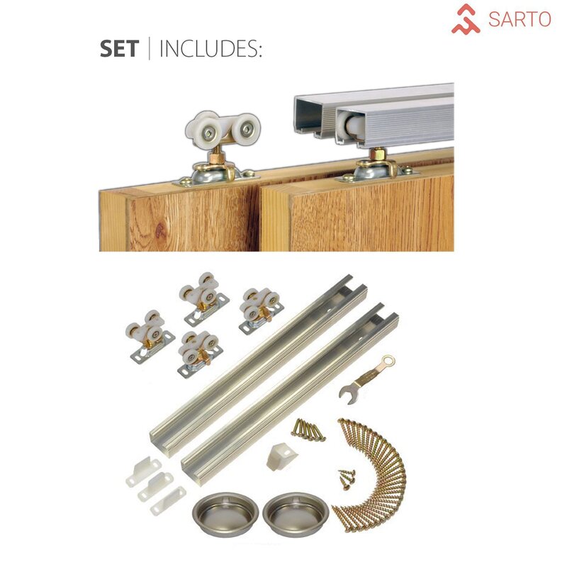 âœ”ï¸ SET INCLUDES- interior use 2 doors with frosted glass, trim kit, 2 aluminum tracks, 4 door hangers, 2 round pulls, 2 door stops, screws. Door is NOT pre-drilled for the hardware. Hardware requires extra 2 1/2″ of opening height. If you order 36×80″ door – Recommended opening is 35×82 1/2″