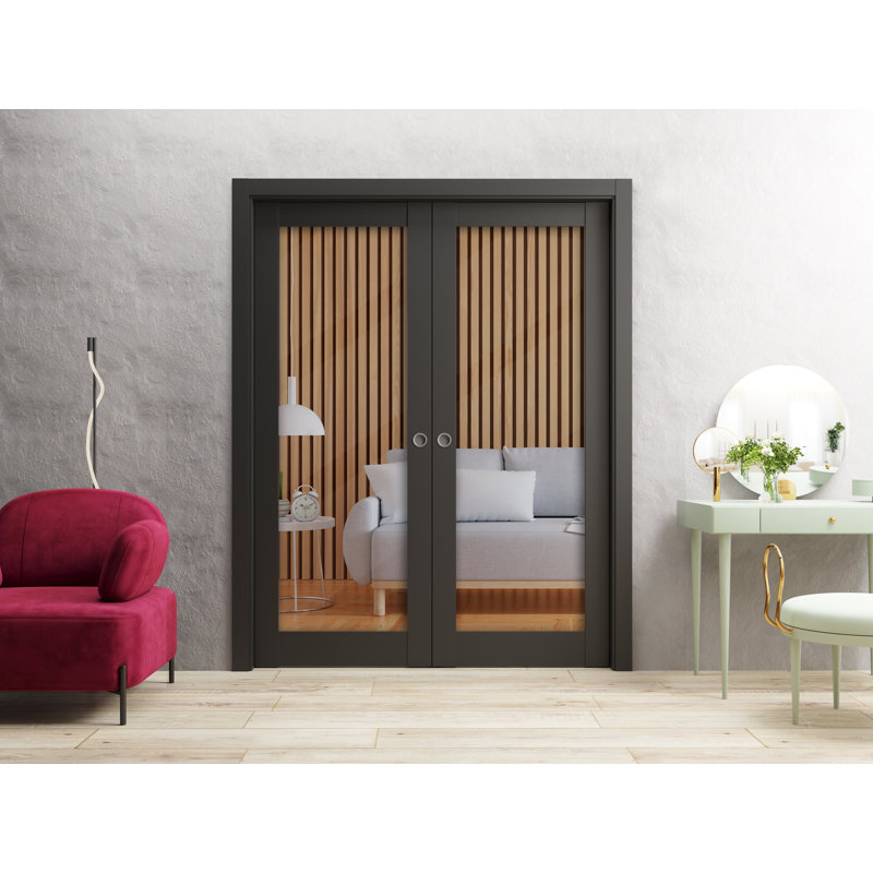 âœ”ï¸ SET INCLUDES- interior use 2 doors with clear glass, trims, pocket frames, door hangers, steel tracks, floor guides, stops, round pocket pulls, screws. Door is NOT pre-drilled for the hardware. Pocket hardware requires extra 4 1/2″ of height. If you order 36×80″ door – Recommended opening is 73×84.5″