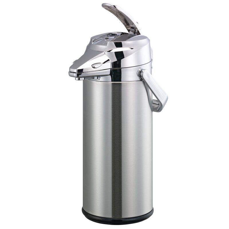 Our Signa-Air Stainless-Lined Airpot with Chrome Lid features 18/8 stainless steel double wall construction with vacuum insulation to keep contents warm for 4-6 hours. This durable airport is great for convenience stores, hotel lobbies, break rooms, and other high-volume settings. The easy-to-use lever lid is designed with convenient snap-on flavor indicators to hang under the pour spout. Keep track of them with the snap-on storage area on the back of the collar.