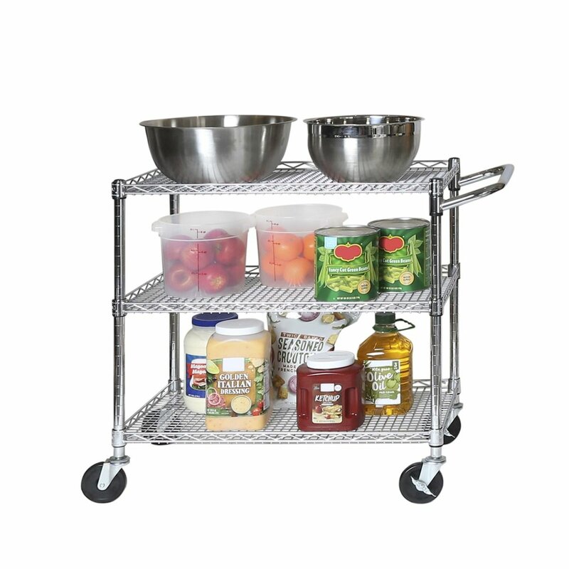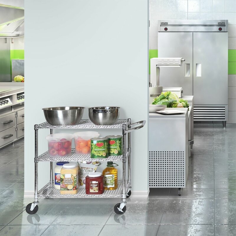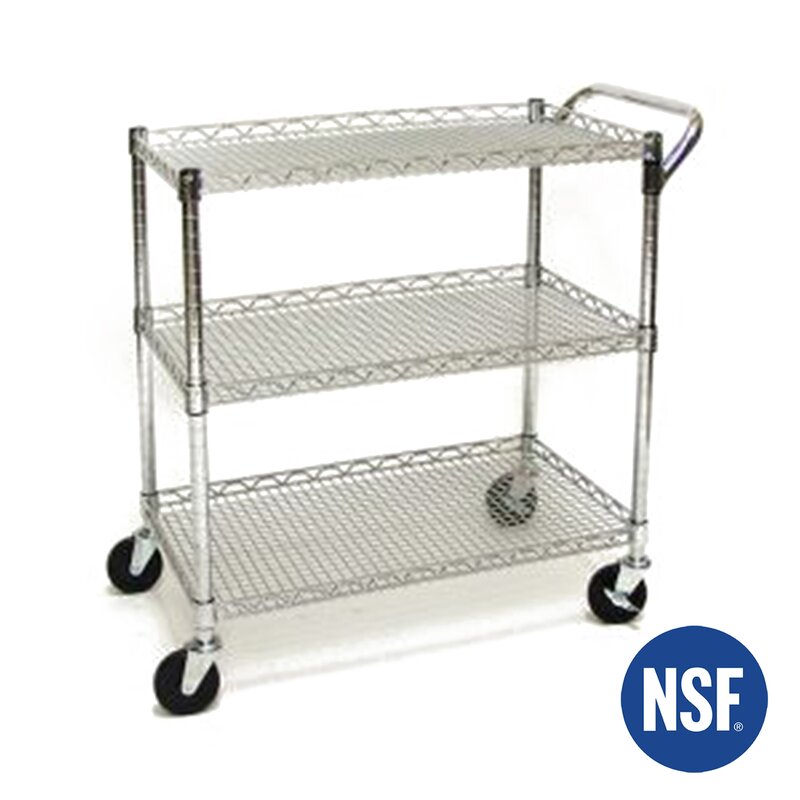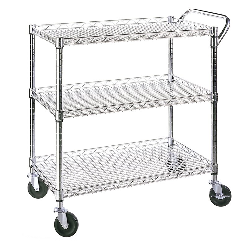Showing a lean cut of beef or displaying sumptuous desserts? The all-purpose utility cart is your mobile setting. The professional-grade cart is made of commercial chrome-plated steel and has adjustable, heavy-duty grid shelves. Features a safety brake on the casters.