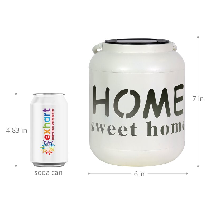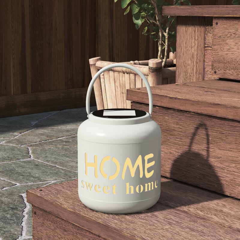 This outdoor lantern brightens your porch or patio with ambient light and a sweet message. It’s made from metal with a solid color finish, and it’s solar-powered for added energy efficiency. This lantern features a cylindrical silhouette with an arched handle, and it showcases light-filtering text cutouts that read “home sweet home” for a charming touch. It comes with an integrated LED bulb, and it’s weather-resistant and damp-rated to stand up to the elements. We recommend placing this lamp in a covered area to keep it protected from rain or sprinklers.