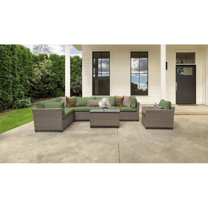 This 7-person outdoor seating group instantly creates a spacious, classic patio setup for lively get-togethers. It includes a large sectional sofa, one chair, and a coffee table, plus all the cushions you need for ultimate relaxation. Each furniture piece is crafted from UV- and rust-resistant aluminum, so they hold up to everyday weather, wrapped in resin wicker in a light brown. We love that the acrylic and polyester cushions are available in a variety of colors – pick one that matches your current deck color scheme or provides a fun contrast. Best of all, the tables have secret storage.