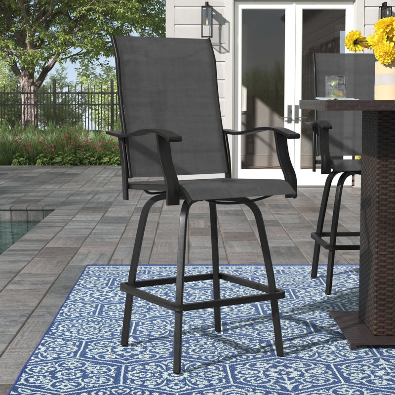 This 2-piece bar stool set has a swivel design that lets you easily move from one conversation to the next on your porch or patio. The frames are crafted from steel with a black finish, and their curved legs feature a built-in support bar for your feet. These stools are upholstered in dark brown polyester, making them just right for your French country or coastal decor. They also feature a waterfall edge and decorative armrests for an extra layer of traditional style in your outdoor space. Plus, this set of stools are resistant to rust, so they stand up to inclement weather.