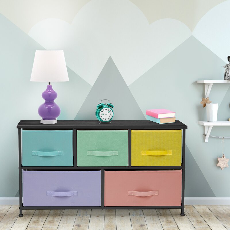 Kid-friendly Design — Sleek wide storage — made with strong steel frame and durable MDF wood top with smooth black finish — drawers made of breathable, non-woven fabric — pastel colors in aqua teal, yellow, purple, peach — wipe clean — minimal assembly required — hardware and instructions included — measures approximately 39.50†l x 11.87†w x 24.62†h.