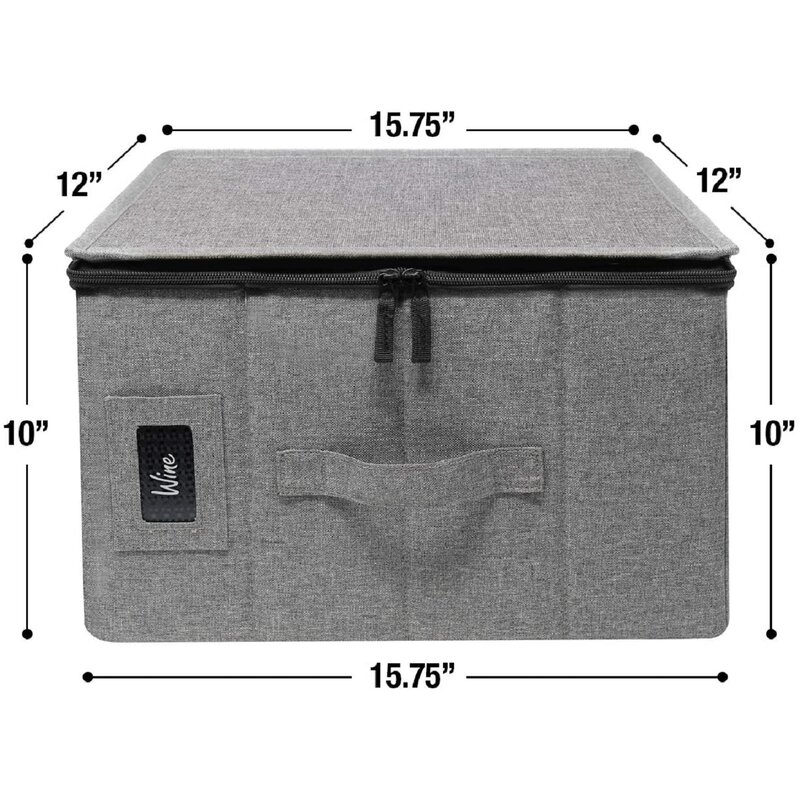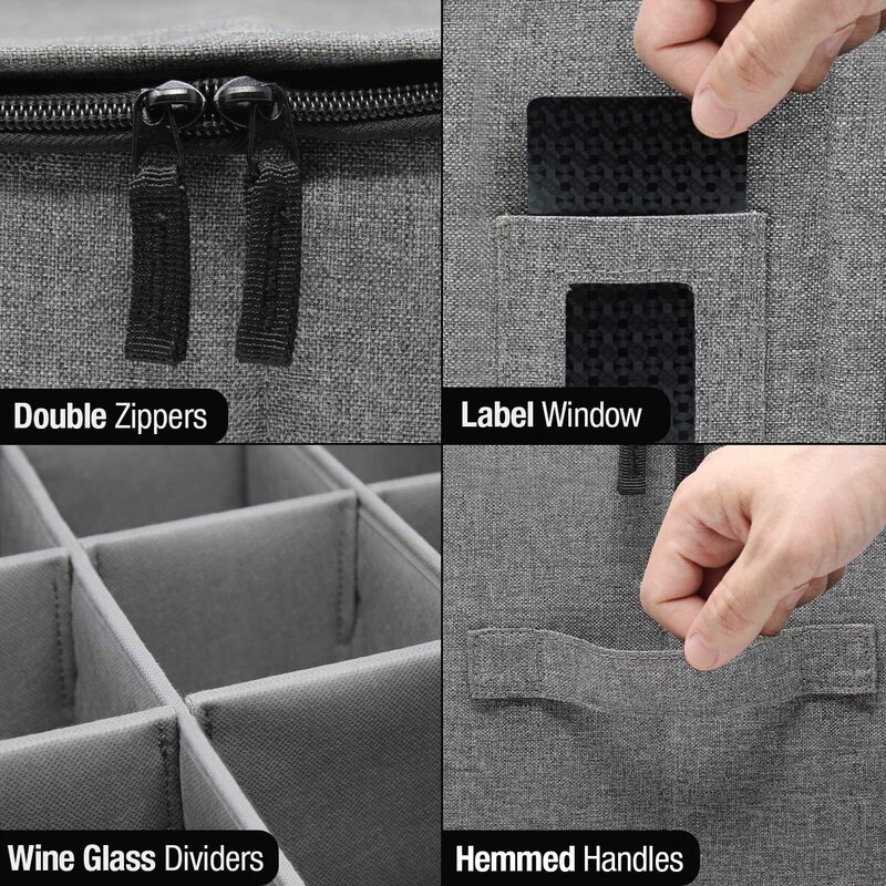 Durable padded design — Minimal assembly — Top loading design — Zipper closure — Conveniently stackable — Sturdy frame with the fully-padded interior — Made of 100% polyester (outside) + nonwoven fabric (inside) + PP board support (inside) — Clean with a damp or dry cloth — Holds up to 12 glasses — Measures approximately 15.75†L x 12†W x 10†H