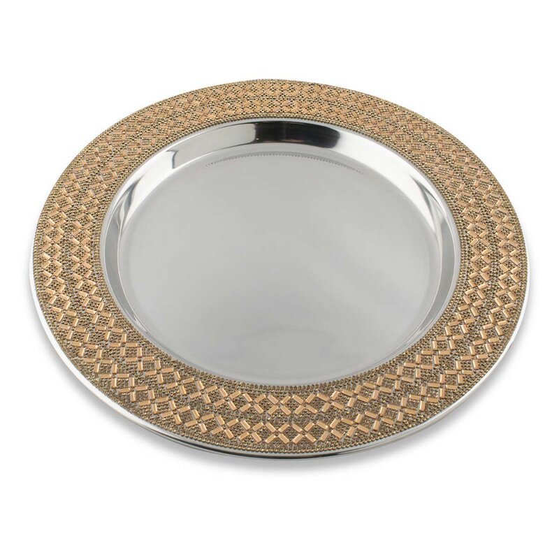Add elegance and shimmer to your table with the glamour of these sparkling charger plates. These plates, decorated with a circle of brilliant rhinestones arranged in an X-pattern, will enhance any place setting or decor. Available in your choice of color.