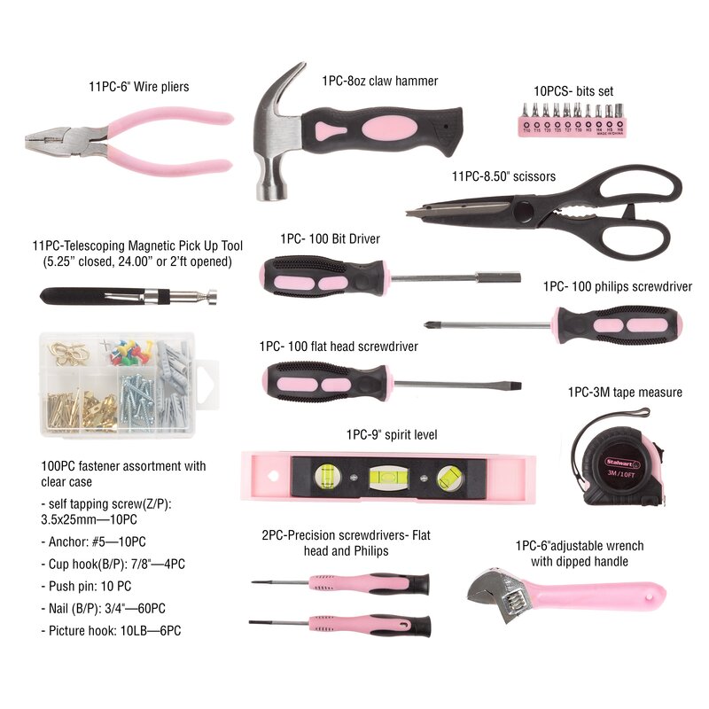 Take on any home improvement or hobby project with the 123-piece toolset. The set includes 100 fasteners and 23 tools, making it ideal for basic home repairs, assembling pre-fabricated furniture and DIY projects in apartments and dorms and for first-time homeowners. The bright pink color makes these tools as fun as they are functional!