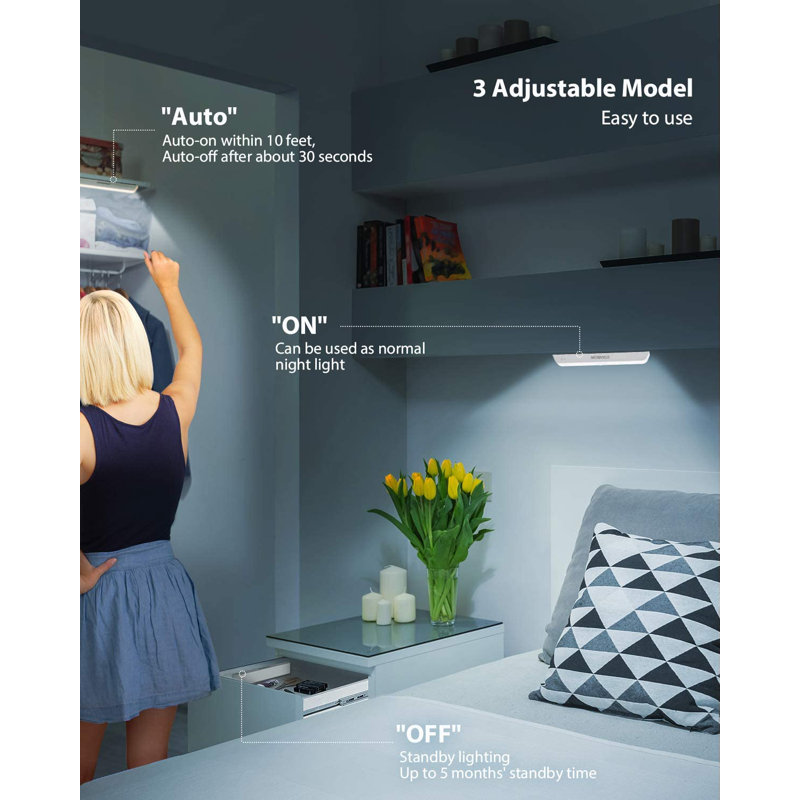 3 Modes Adjustable: Under Cabinet Lighting Motion Sensing(AUTO)/Instant On/Instant Off, can be used as a normal night light. In night or dark places can set Under Cabinet Lights to “AUTO†Mode. Auto-on within 10 feet, Auto-off after about 30 seconds if no motion detected.