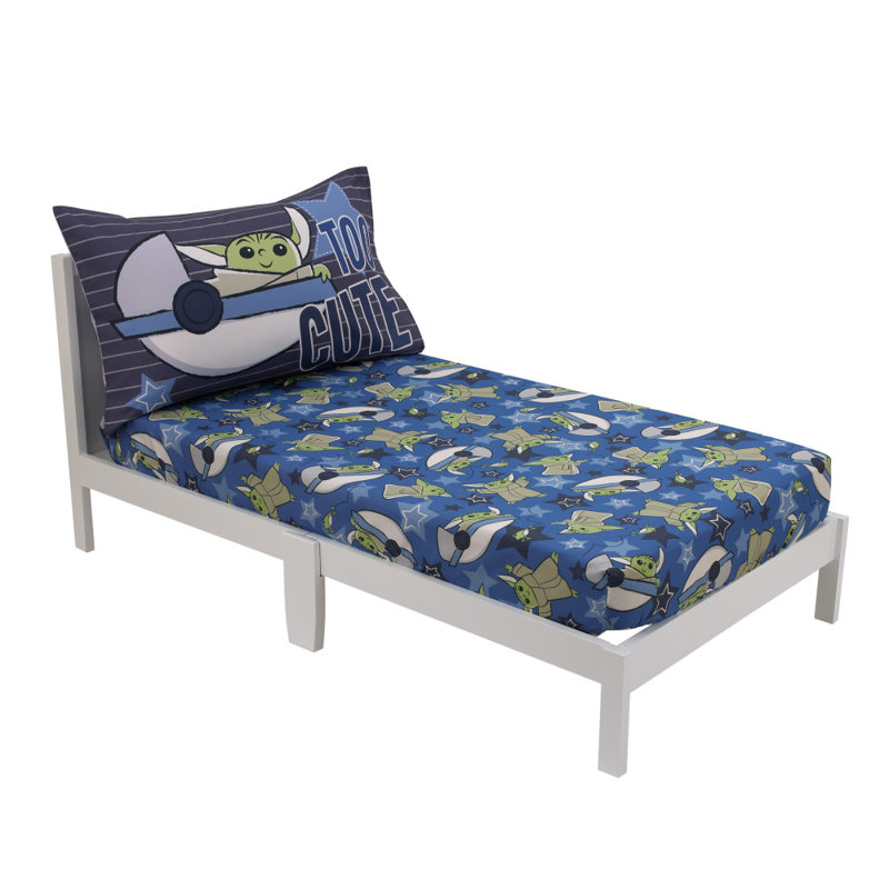 The Child Cutest in the Galaxy 2 Piece Toddler Sheet Set includes a fitted bottom sheet and reversible pillowcase. Features “Too Cute” Grogu, his hover pod, Sorgan Frog, and stars! Designed in shades of blue, green, gray, and navy. Made of super soft fabrics for a snuggly sleeping surface. The 20″ x 30″ pillowcase is reversible, and the fitted sheet measures 28″ x 52″ x 8″. Fits a standard size crib/toddler mattress. Includes full elastic edges for a safe and snug fit. Coordinates with Star Wars Mandalorian The Child Cutest in the Galaxy toddler bedding and accessories.
