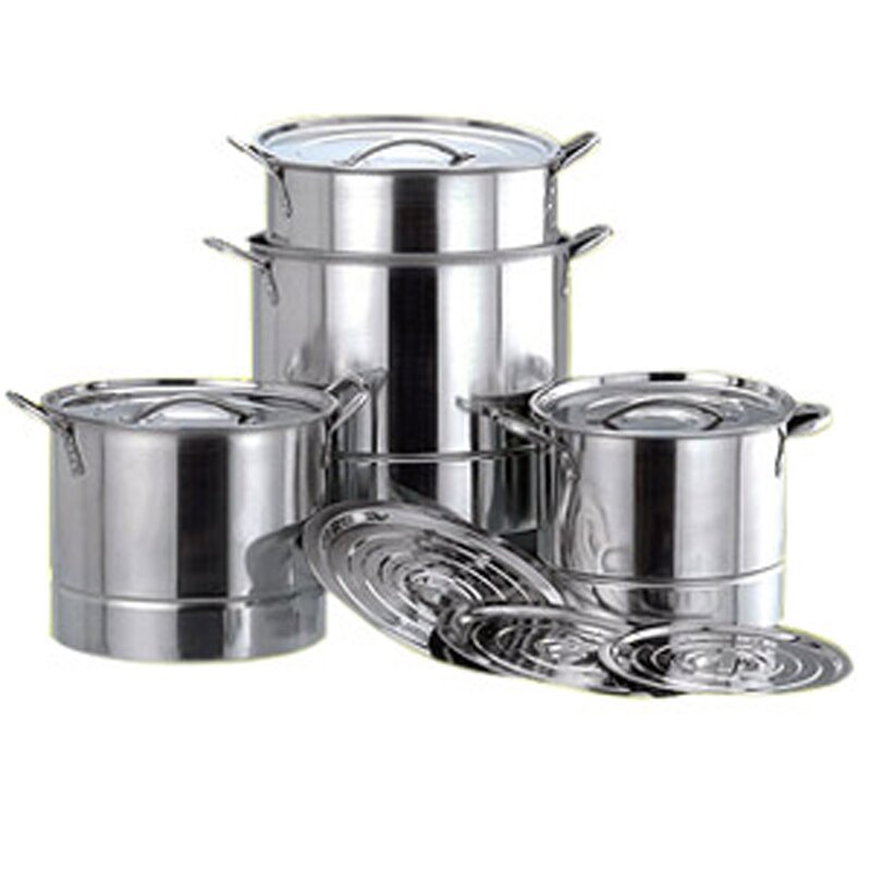 Set includes 8qt, 12qt, 16qt and 20qt pots with lids, steamers and easy to grab handles. This steamer stockpot is dishwasher safe.