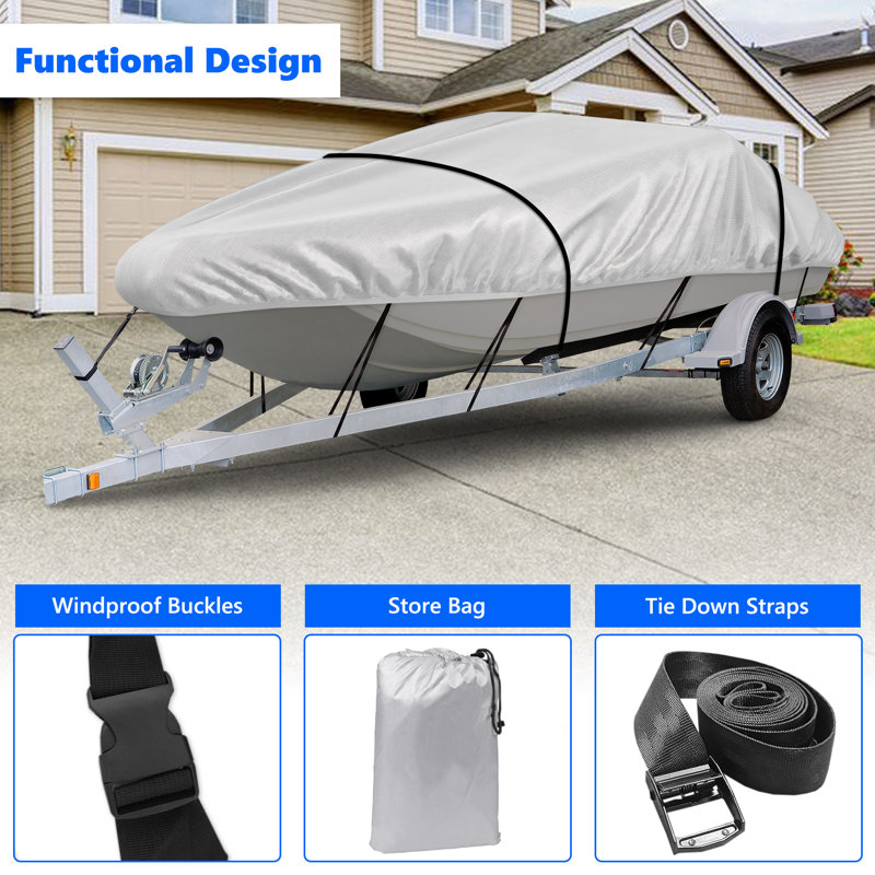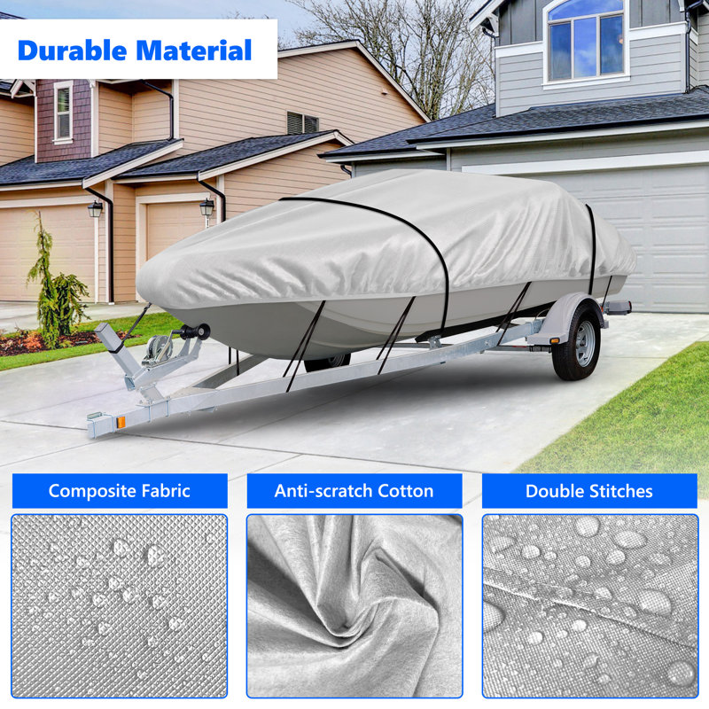 Univeral size: Our boat cover fits V-HULL fishing boats; V-hull tri-hull runabouts, bass boats, fish & ski, and pro-style bass boats, every bost cover has an extra 20-inch beam width fabric to ensure the boat body was covered more.