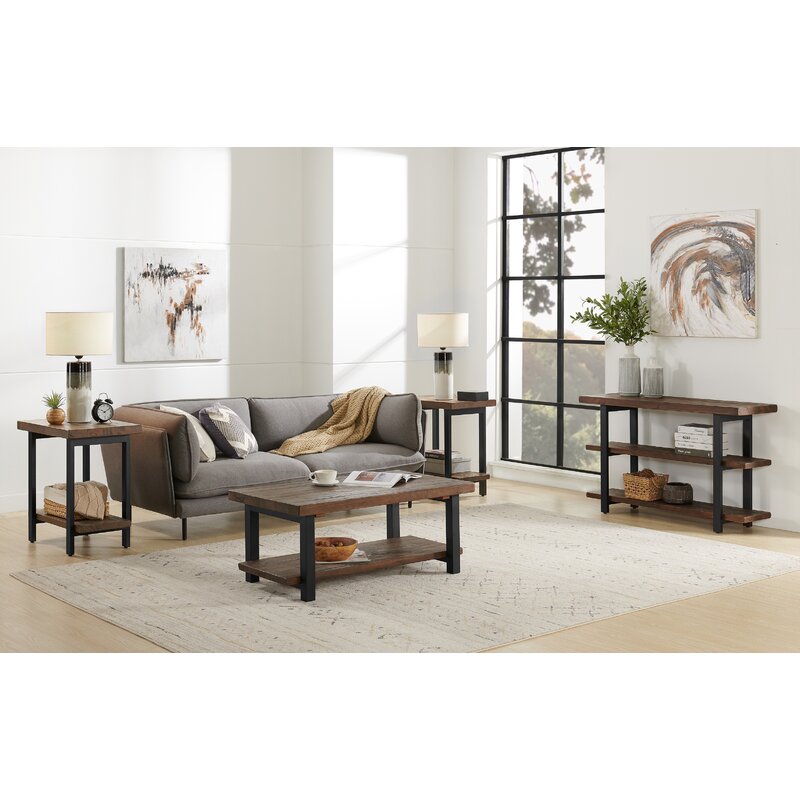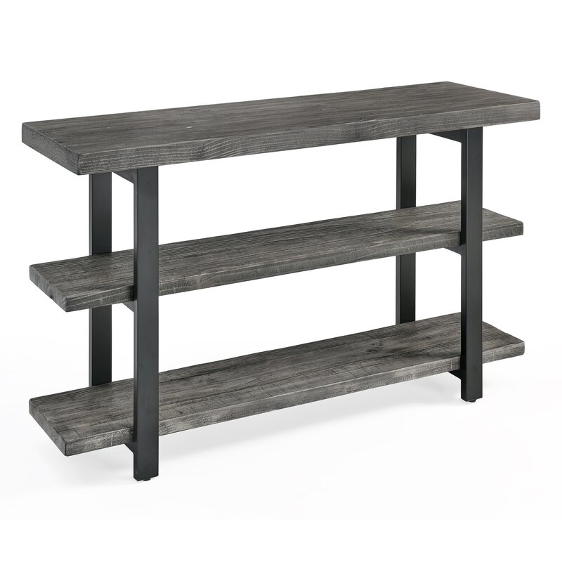 Elegantly display your favorite decor and add rustic charm to your space, with this lovely console table. Perfect in your living room or added to the entryway, it showcases a lodge-worthy look crafted from two shelves supported by sleek powder-coated steel legs. The solid wood top and shelves are crafted from rustic pinewood with a mix of new and reclaimed wood including natural knots, holes, and imperfections which add character to the look.