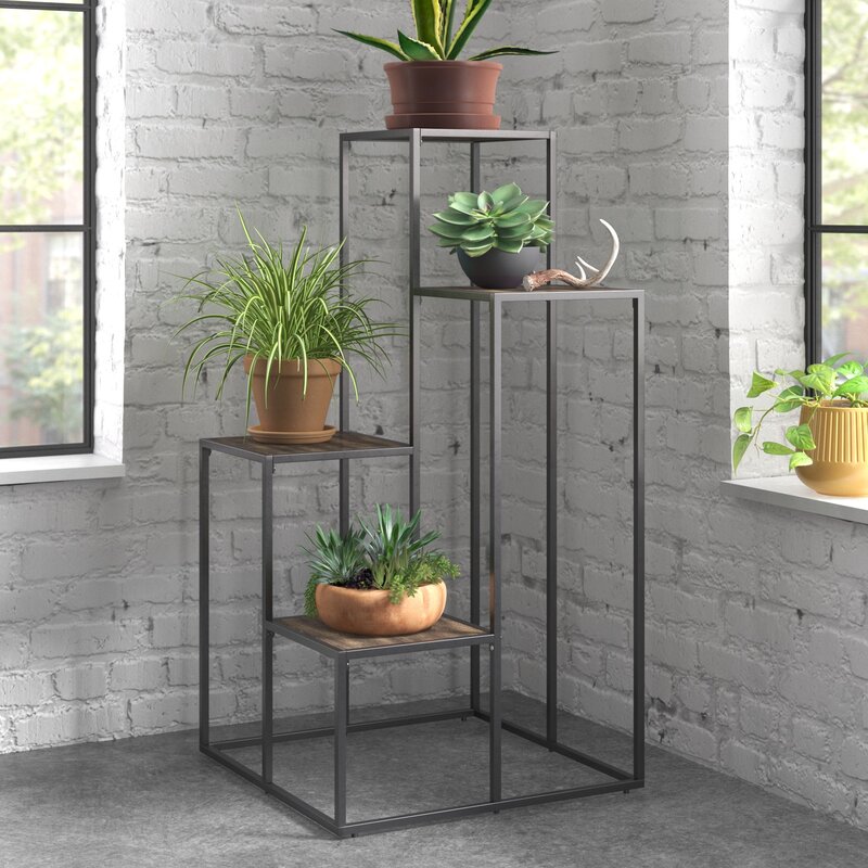 Flex your green thumb with this multi-tiered plant stand, great for corners and sunny spots in your home. Set on a sled base, this stand has an open frame crafted from metal to give your space an industrial feel. Each of the four shelves is made from engineered wood to add some rustic style to your living room, home office, or sunroom. Plus, each tier is a different height, so it almost looks like a city skyline. Overall, this plant stand is 25.6″ square, giving you plenty of room to put your smaller succulents, herbs, and ferns on display.