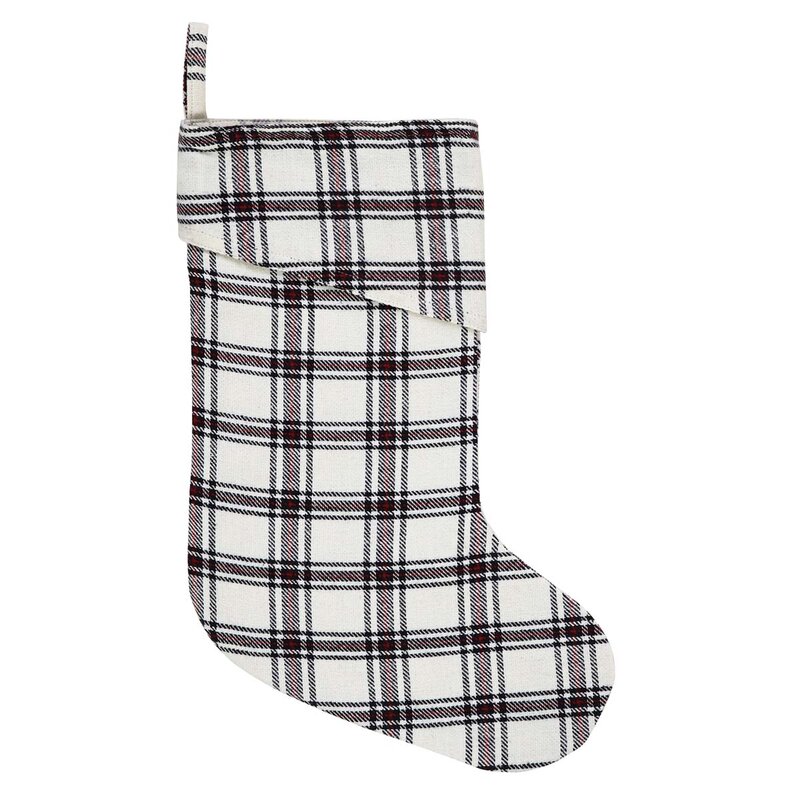 Welcome, Christmas morning this year with this rustic plaid stocking. It’s made with cotton fabric that comes in a sleek ivory hue, with brick red and black stitching for a modern spin on a traditional design. A slightly slanted cuff along with a turned-edged seam brings a tailored touch to this festive piece of holiday decor. A loop at the top corner makes it a cinch to hang on your fireplace mantel or the wall beside your tree.