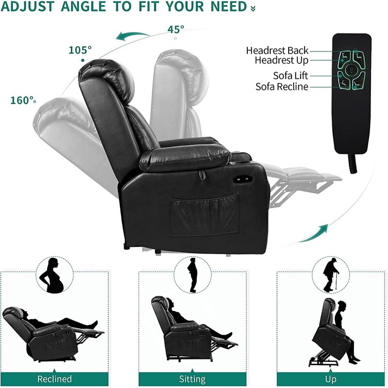 This lift recliner chair for the elderly offers 3 tensity levels and 5 massage modes to soothe legs, thighs, lumbar, and shoulders along with lumbar heating.