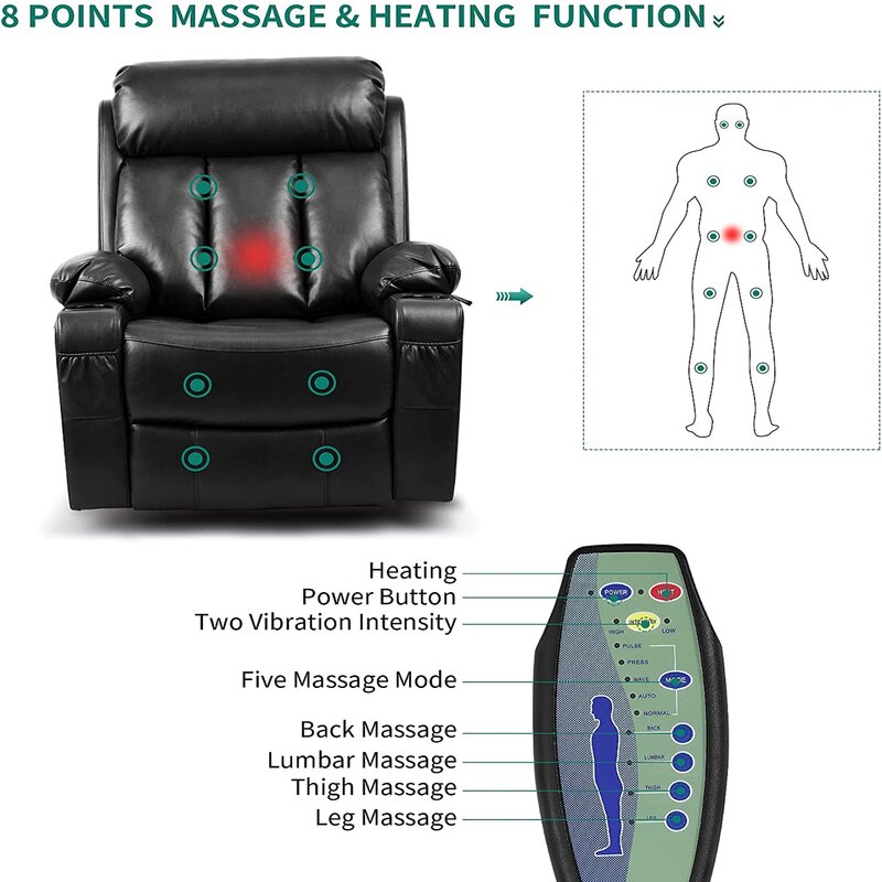8 massage points for the back, lumbar, thighs, and legs respectively. The heating function further promotes blood circulation.