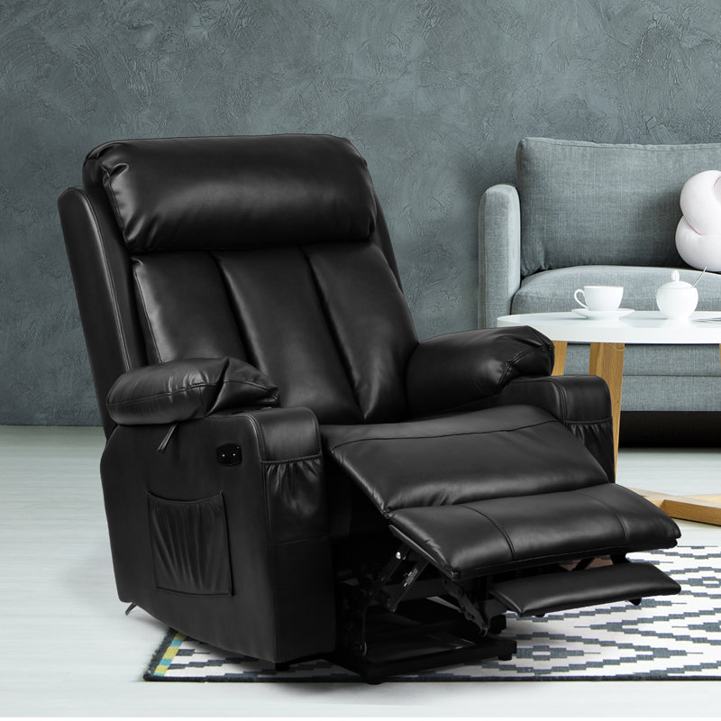 This power-lift recliner makes it easy to get in and out of your seat while also grounding your space in traditional style. Its frame is crafted from stainless steel, and it’s built on a black metal base that leans back or forward with the push of a button. We love how the remote-controlled heating and vibrating massage features keep you cozy during movie night. This tufted recliner with pillow top arms is wrapped in water-resistant faux leather with a black hue that complements your industrial-inspired space. Coil springs and foam and cotton filling give it the right amount of cushion and support. Plus, this recliner has a pocket on the side for books and magazines.