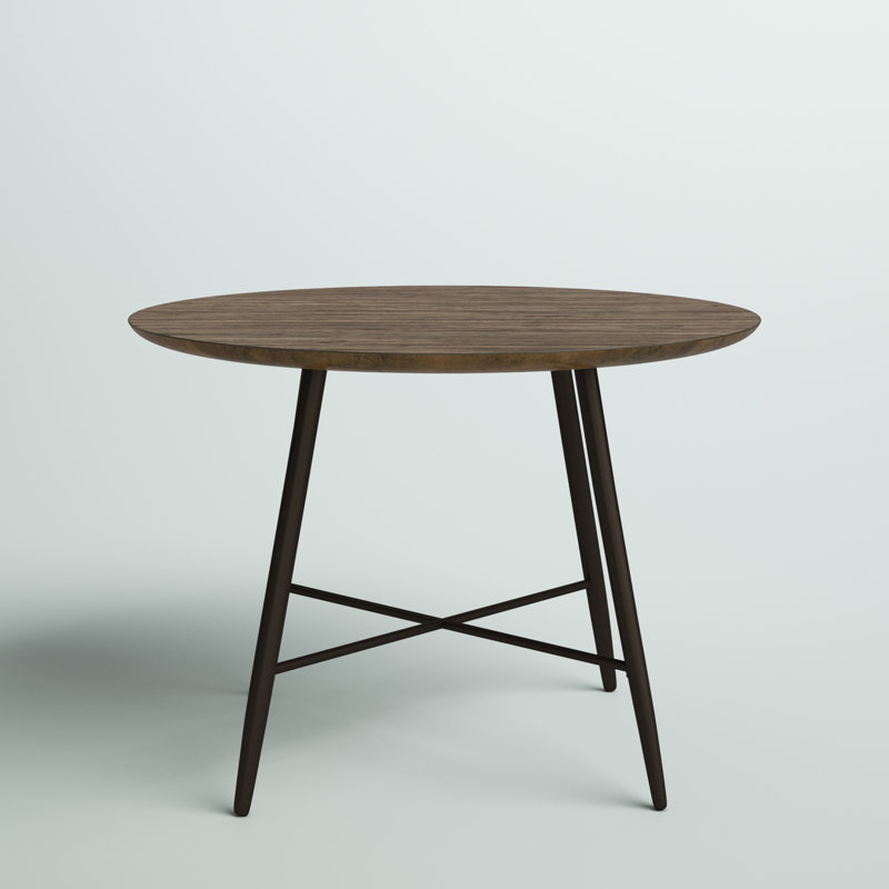 This mid-century modern round dining table packs maximum style into minimum space. This piece speaks of the virtues of simple beauty in hushed tones. One rounded piece sits atop four elegantly tapered, flared legs made of heavy gauge metal and finished in a dark brown. The tabletop features a distressed walnut finish, the rustic quality of which contrasts pleasantly with the piece’s overall sleek silhouette. The organically sloping beveled edge of the tabletop and the X-shaped stretcher bar on the table’s base complete the minimal look. This table’s modest footprint allows it to seat four comfortably in most eat-in kitchen or small dining spaces. Assembly required.