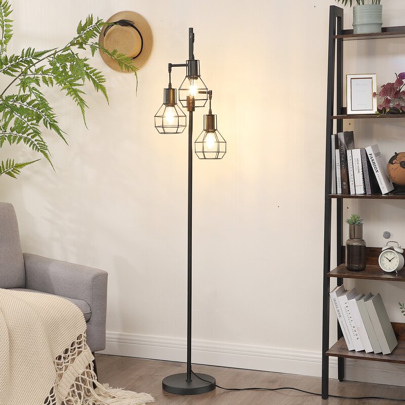 This floor lamp lights up your space with a sleek, industrial aesthetic. It’s crafted from iron with a simple circular base and neck in a smooth black finish. Three lights adorn the top with a playful, tree-like ascension, and the wire cage lantern shades create a modern, exposed-bulb look. We love that this floor lamp has a dimmable rotary switch on the pole, so it’s easy to adjust the light to just the right level of brightness.