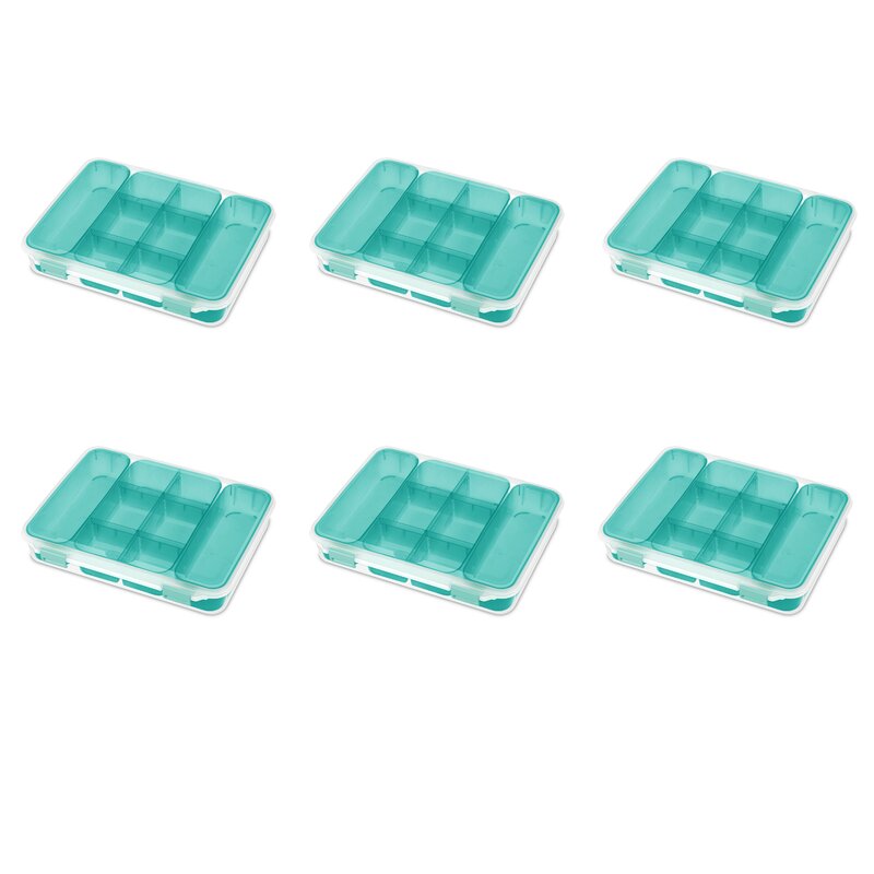 Need help keeping small items sorted and contained? Ideal for crafting, beauty, office, hardware, and other hobbies. The slim shape makes this a perfect grab-and-go storage container. The three tinted trays are removable to allow you to customize your storage space, and provide easier access to supplies. The long trays will accommodate items such as scissors, paintbrushes, pencils, glue, and other tools, while the six compartment tray is perfect for keeping smaller items contained. Color accent latches secure the lid to the base, keeping contents in their compartment. When in use, the hinged lid opens easily and stays attached so it cannot be misplaced. Stack Divided Cases neatly on top of each other, or stand on its side for efficient use of storage space.