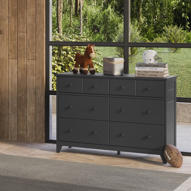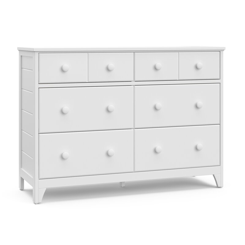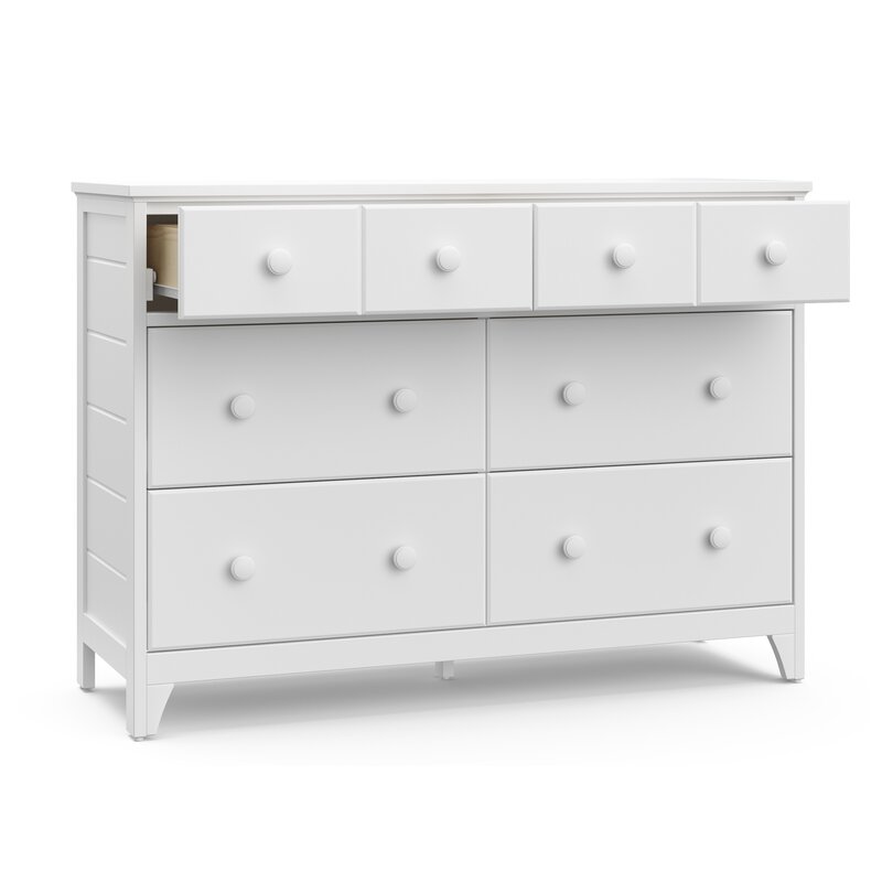 The Storkcraft Moss 6 Drawer Double Dresser is a universal bedroom storage solution, designed in the popular “Modern Farmhouse” style that will be sure to elevate the look of any nursery, children’s, or teen’s bedroom. Complete with detailed, textured shiplap side paneling, this stylish dresser is crafted with high-quality wood and composites, outfitted with durable steel hardware, and equipped with smooth-gliding Euro-glide drawers with metal safety stops. The Storkcraft Moss 6 Drawer Double Dresser is available in multiple child-safe, non-toxic finishes to match your bedroom decor. The Storkcraft Moss 6 Drawer Double Dresser complies with all applicable federal anti-tipping standards and is expertly tested by independent laboratories to guarantee this product meets the highest standards for your child’s safety. This dresser is also backed by Storkcraft’s 1-year limited warranty and supportive customer care. Exclusively from Storkcraft, proud recipient of the 2022 Women’s Choice Award for 9 out of 10 Customer Recommended Baby and Kids Furniture. Complete the Storkcraft Moss collection with the matching Storkcraft Moss Convertible Crib with Drawer.