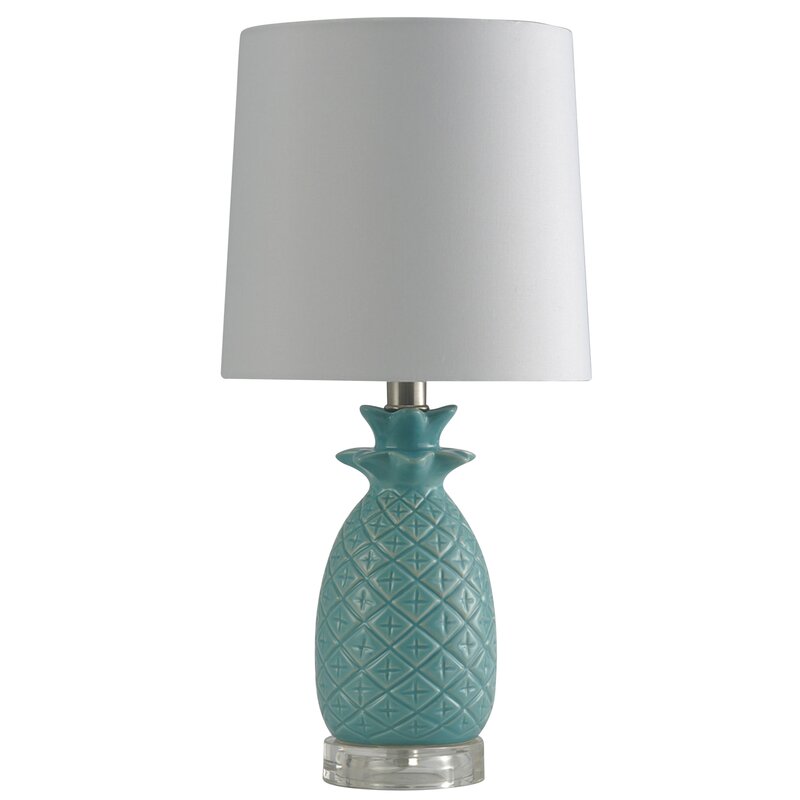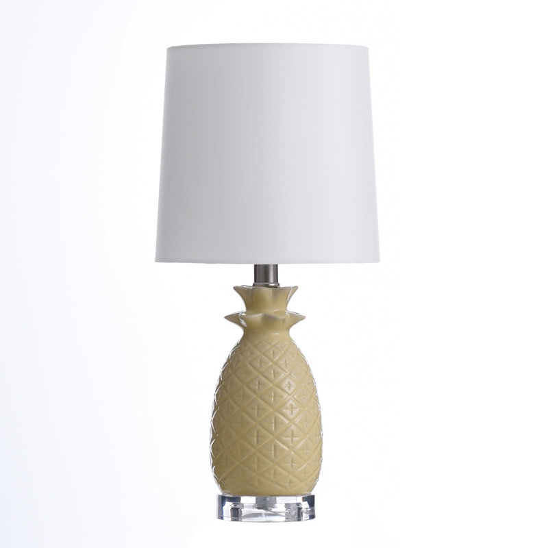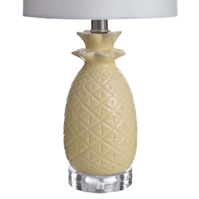 This vintage-inspired ceramic table lamp is made with a fun pineapple base motif in a yellow finish. It’s centered on a round clear base with a white hardback shade. This lamp adds a cool mid-century character to any tabletop in your home.