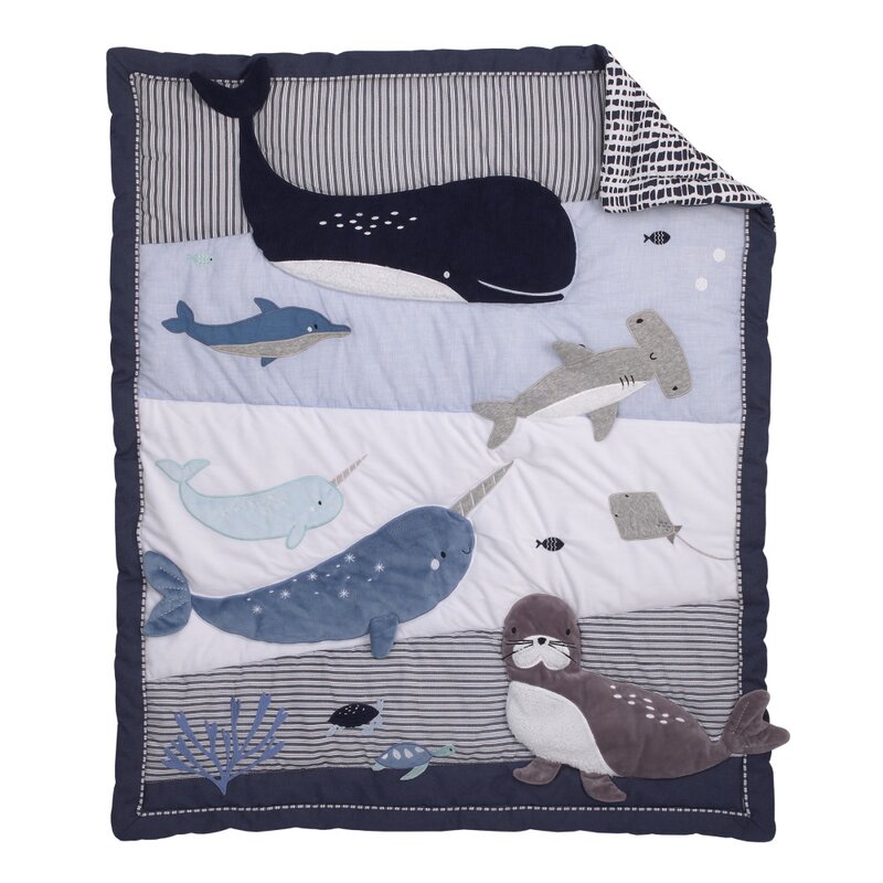 The comforter has various sea animals with appliques featuring 2D elements and a printed back. This comforter is perfect for tummy time. The fitted crib sheet fitting a standard size crib mattress. Features elastic around the edges for a snug fit. Make bedtime fun.
