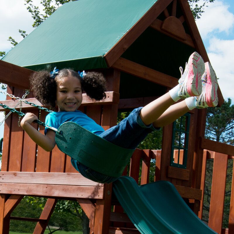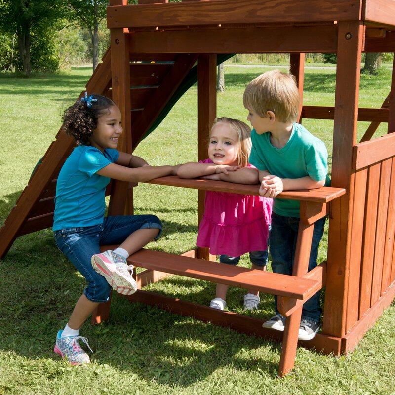 The product comes complete with lumber, accessories, and hardware. The playset includes 2 swings, a glider, a super summit slide, and a climbing wall with 8 climbing rocks to provide hours of fun activities for your child. The Willows Peak also offers ample deck space and plentiful seating.