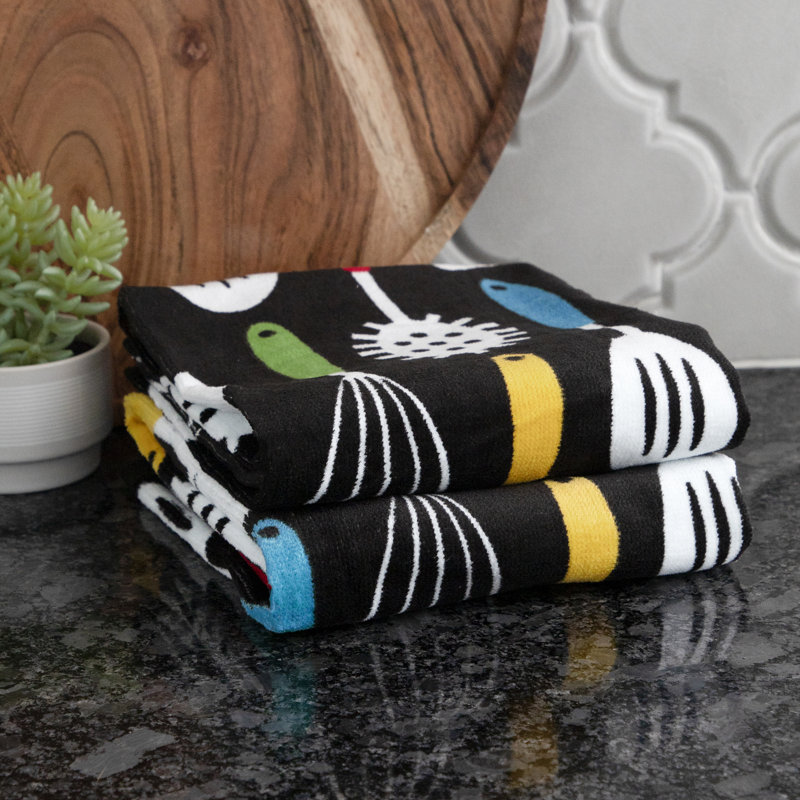 I‘m delighted with the splashes of color on the handles of the utensils printed on the black dish towels.My kitchen has black appliances so the touches of color really pop.