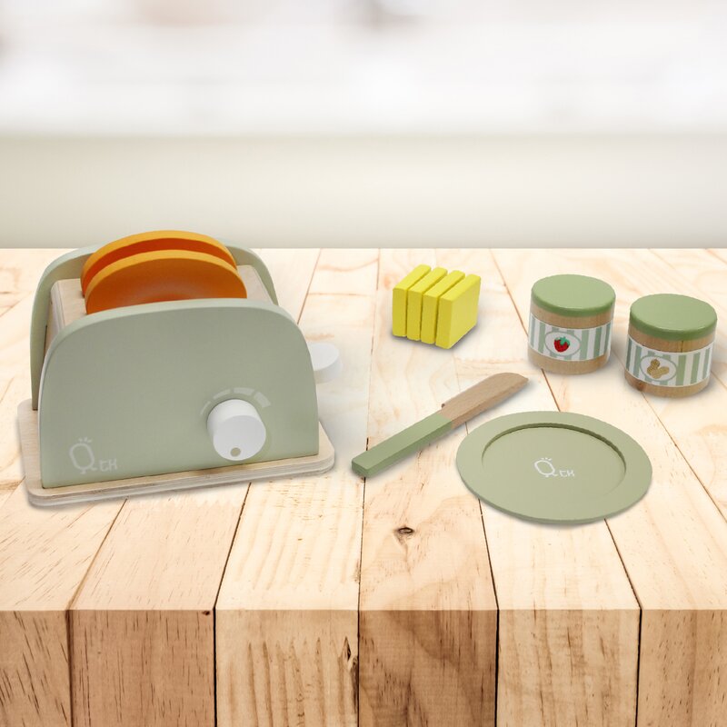 11 PC. KIDS KITCHEN TOASTER SET: Designed with natural wood finishes, turning knobs, and a functional lever, making it great for both boys and girls, and it completes any Teamson play kitchen set