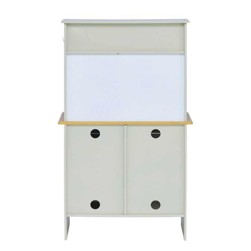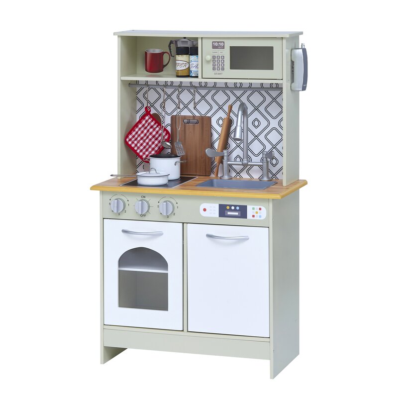Give your little one their own cooking space with the Teamson Kids Little Chef Boston Classic Kids Kitchen Playset. This white retro-style play kitchen features a natural wood countertop, white brick backsplash, and gold hardware, making it great for both boys and girls, and it completes any home, classroom, or playroom. The interactive design features an openable oven and microwave doors, 3 turning oven knobs, 3 oven burners, a shelf, a sink, a rod with hooks, and a cabinet to enhance your little one’s playtime. Included accessories feature realistic details with a pot holder, ladle, spatula, phone, pot & lid, pan, plus salt & pepper shakers! This toddler kitchen encourages role play and lights up your little chef’s imagination and creativity.