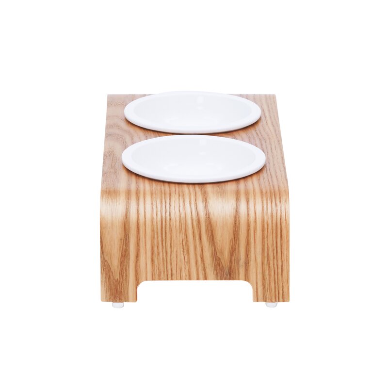 Included: one curved ash wood feeder tray with two white ceramic dishes for cats or small dogs.