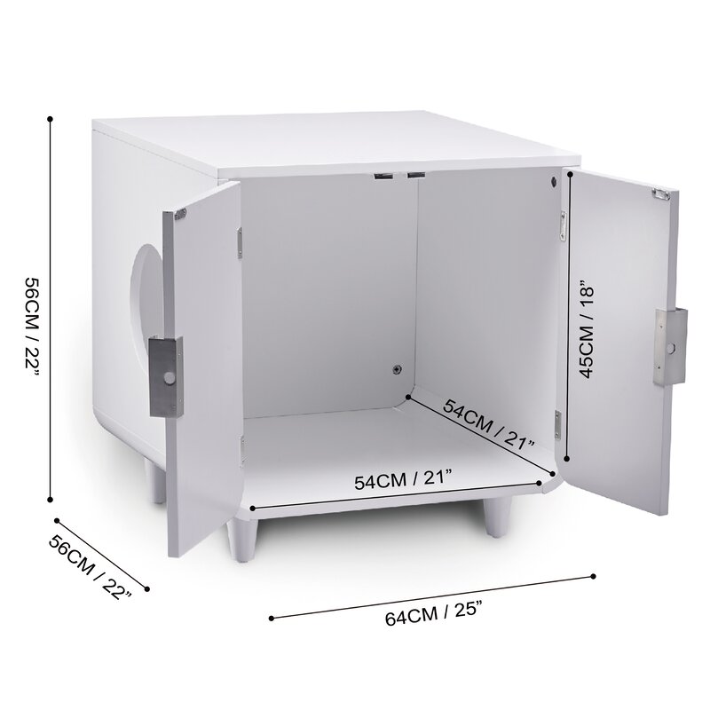 Give your furry friends some privacy while adding contemporary decor to your home with this litter box enclosure. This sleek pet litter box features a classic mid-century design with a mocha walnut finish and black accents for a modern addition to any space. This versatile piece of furniture can be used to house a litter box or a pet bed while also functioning as a side table or a nightstand. The large hole on the side of the litter box allows easy entry and exit for convenient use, and its rounded corners keep you and your furry friends safer. The two cabinet doors on the front of this box provide instant access to change litter or put in a pet bed. Crafted from durable, eco-friendly MDF, this litter box is built to provide your and your pets with long-lasting use. This litter box enclosure fits conveniently in your bedroom or living area without taking up too much space.