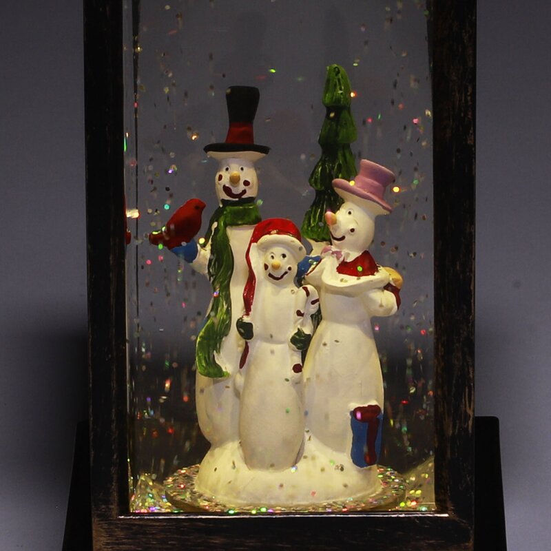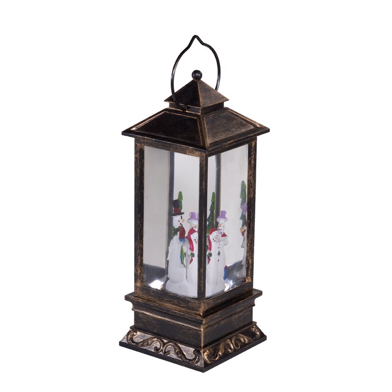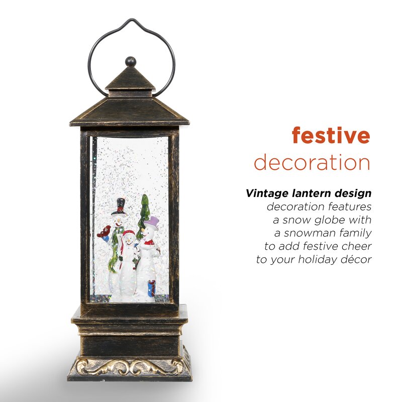 Add festive cheer to your desktop with the lantern! This features a classic lantern design to bring nostalgic holiday joy to your home. Inside the lantern is a cheerful snow family with a warm LED light to brighten your decor. The glittering snow is kept afloat by a hidden motor for your convenience. This oil-filled, vintage lantern decoration requires 3 AA batteries to operates. It includes an automatic 6 hour on/off timer to save your battery and ensure a hassle-free experience. The lantern is the perfect addition to your holiday decor!