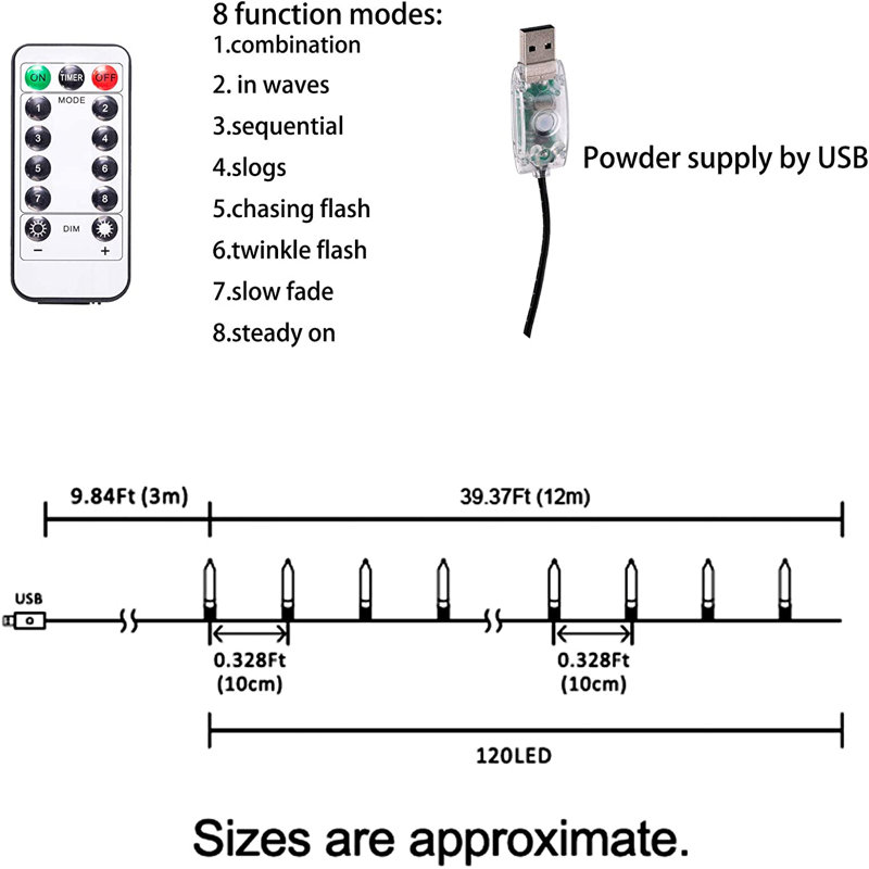 8 Lighting Modes for Your Choice – 120 LED lights, you can freely change 8 lighting modes in your hand through the included remote control: Combination,in waves, sequential, slogs, chasing flash, twinkle flash, slow fade, and steady on.
