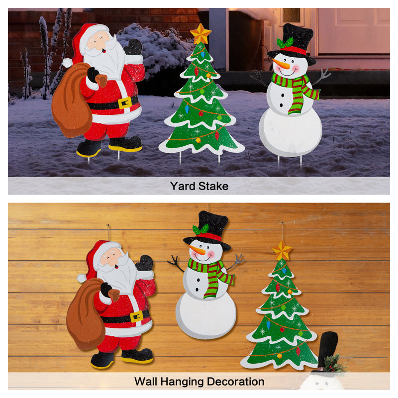 24″H 3-Piece Metal Christmas Santa/Snowman/Tree Yard Stake or Wall Decor Set