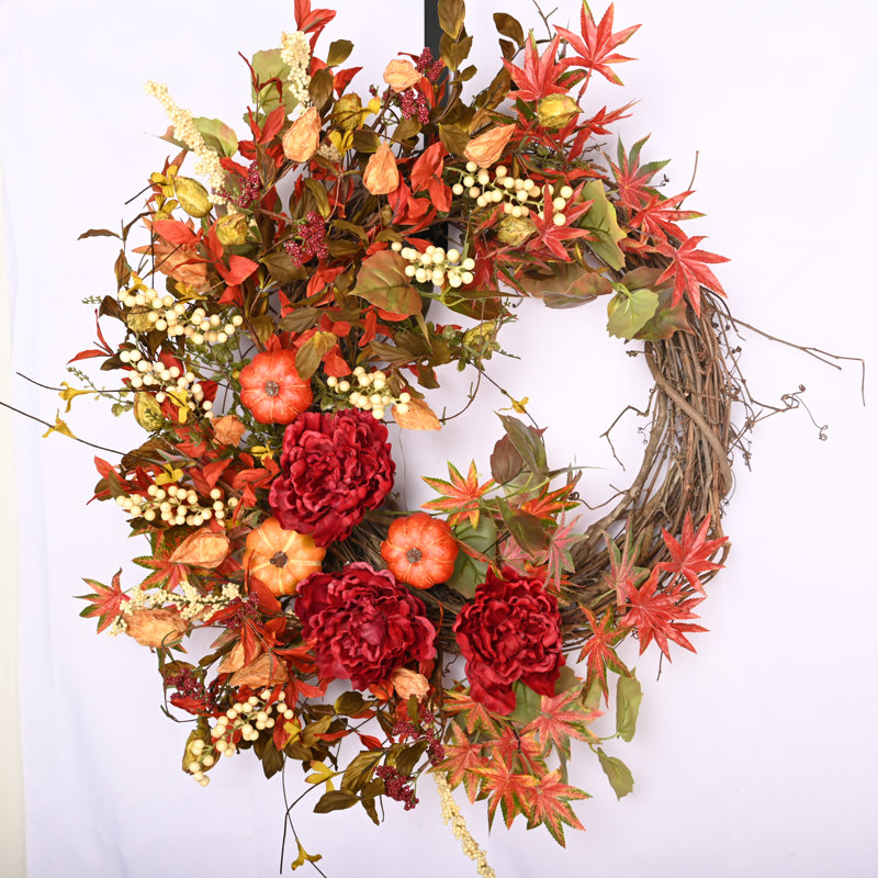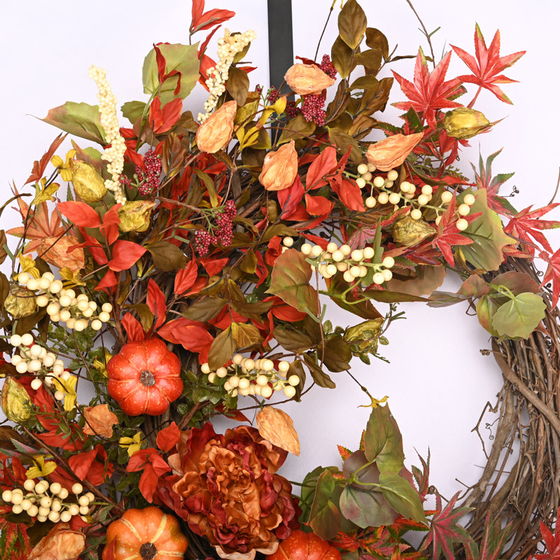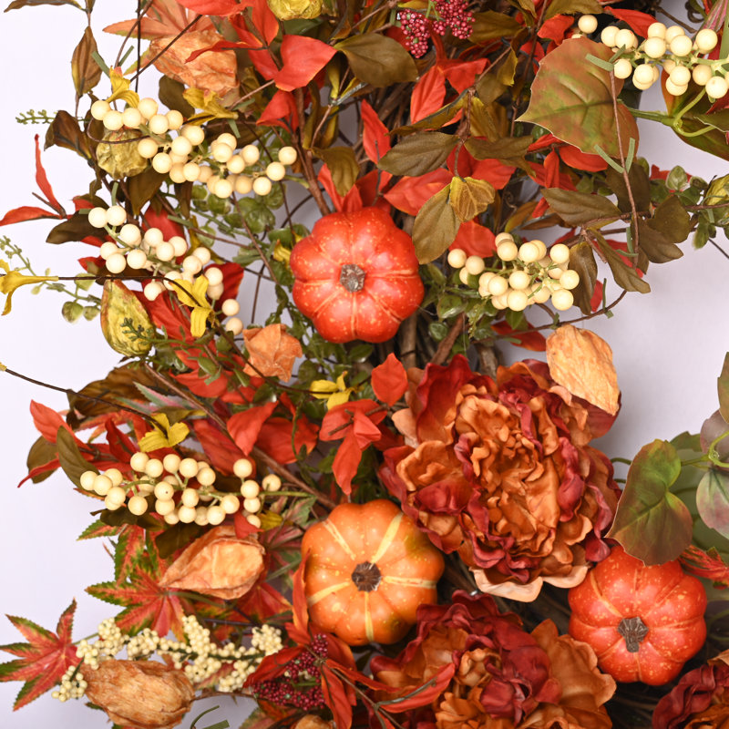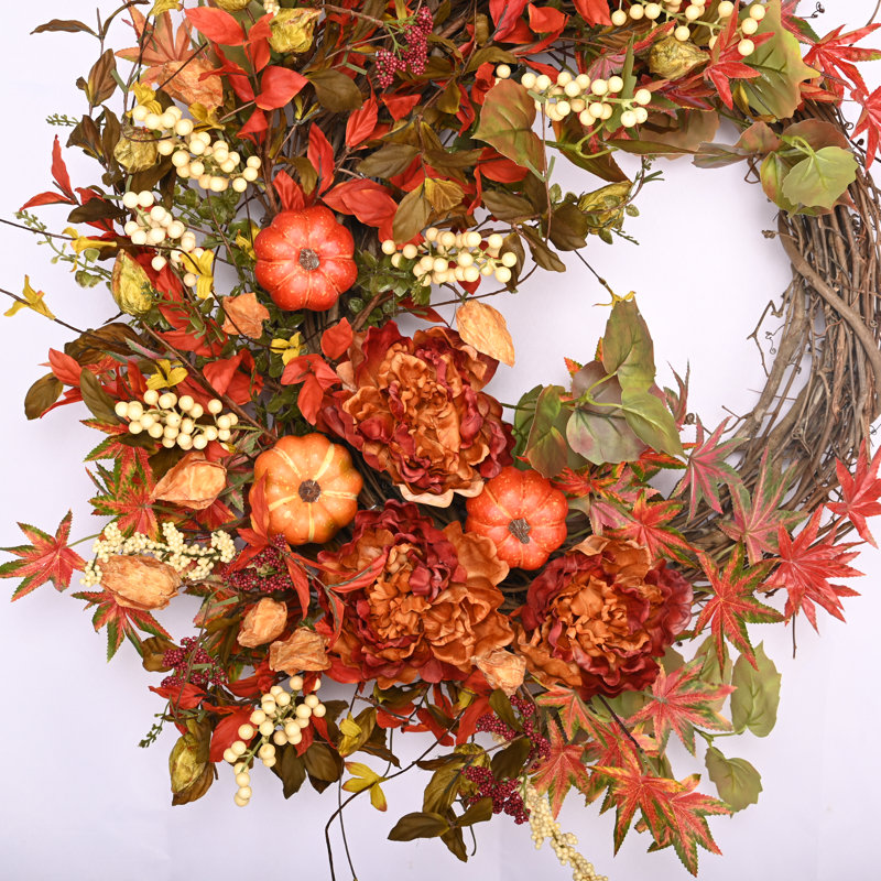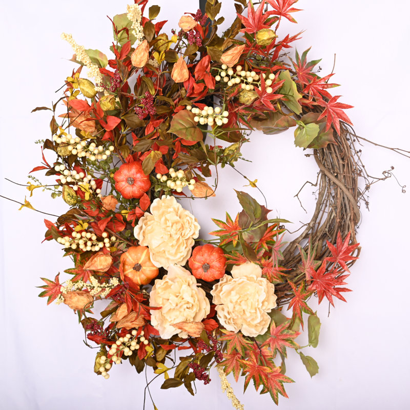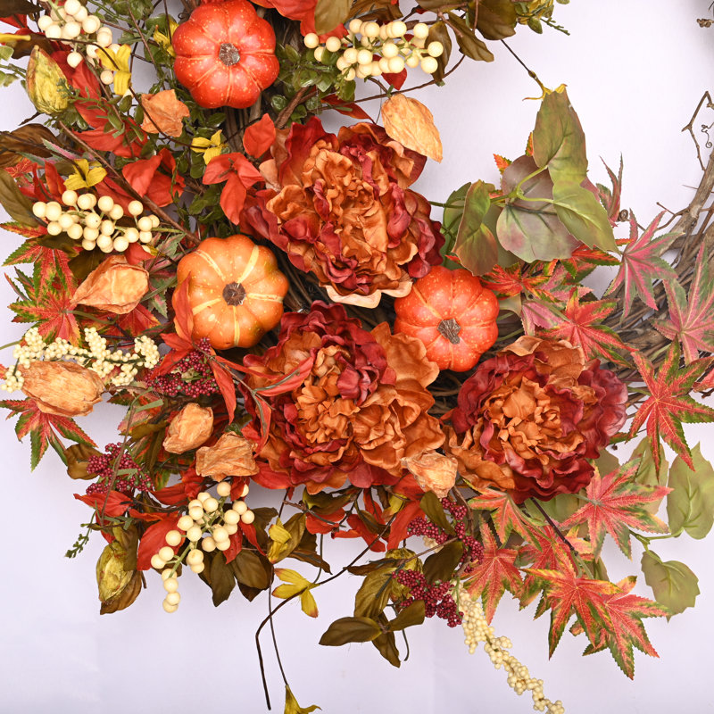 Large artificial front door indoor wreath, fall thanksgiving day pumpkin wreath.