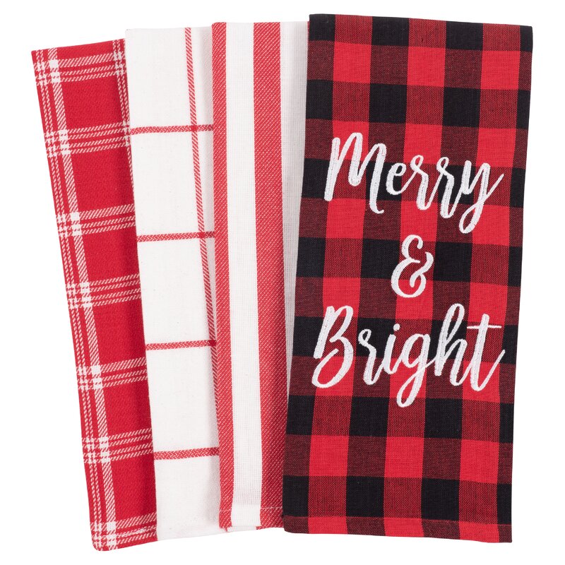 This 100% cotton, seasonal set of four kitchen towels features a festive, Merry and Bright print towel and three varying yarn-dye towels. Both fashionable and useful in the kitchen, these Christmas towels are great for cleaning up spills and drying dishes. This set makes a lovely holiday housewarming gift.