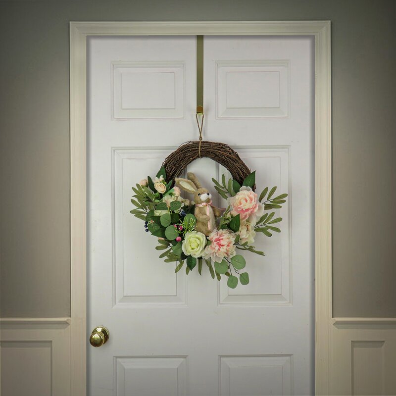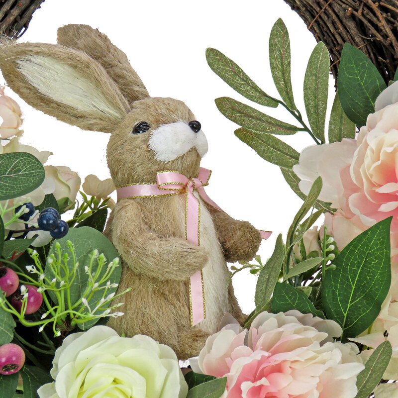 Welcome the Easter holiday and spring season with this attractive wreath decoration. A woven branch ring base anchors a spray of assorted long-stemmed leafy greens, pastel-colored flower blooms, and berry clusters. Sitting happily in the center of this floral arrangement and wearing a ribbon and bow necktie is a little brown bunny rabbit. The bunny is constructed of soft straw fibers sculpted over a foam core. Display this unique wreath on doors, walls, and windows in indoor locations.