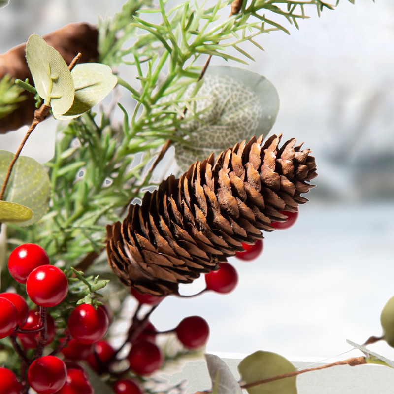 Crafted with artificial berries, pine cones, pine needles with cement base