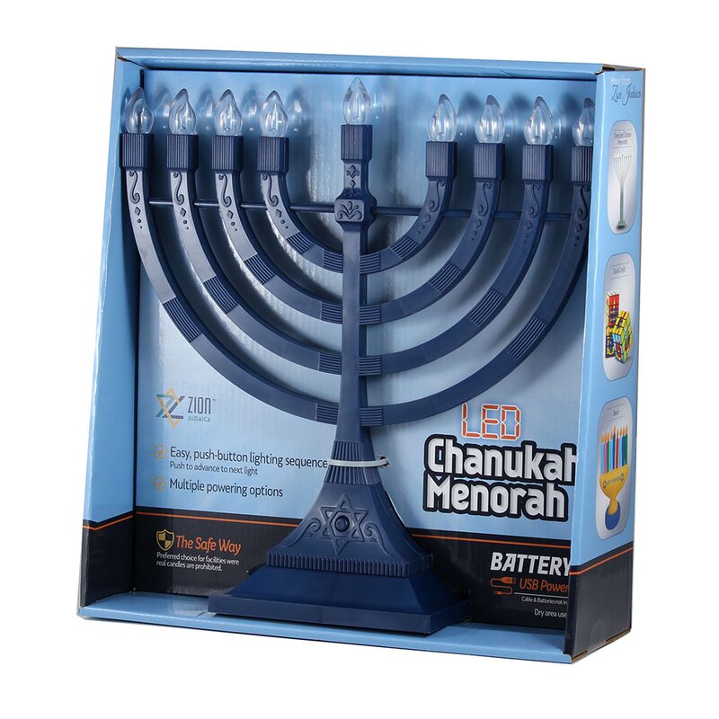 Very new classic Chanukkah Menorah. This Menorah has become an instant shoppers sensation, the menorah that has it all: Flame shaped permanent bulbs (never change them). Absolutely beautiful body design. Push button to advance to the next light. Open box display packaging. Multiple Powering options: Use 4-AAA batteries (not included). Use the 5.1 USB port to connect with a phone charger or USB-cable to any source, computer, wall outlet and car.