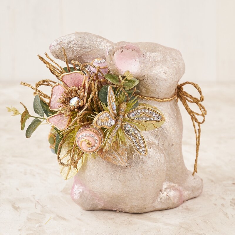 Easter Elegant Bunny-10 inches tall with capiz floral, jeweled dragonflies, eggs, and faux foliage. An attractive Easter bunny to display on the table, in the living room, or all-around your home, creating an Easter-worthy look for your space.