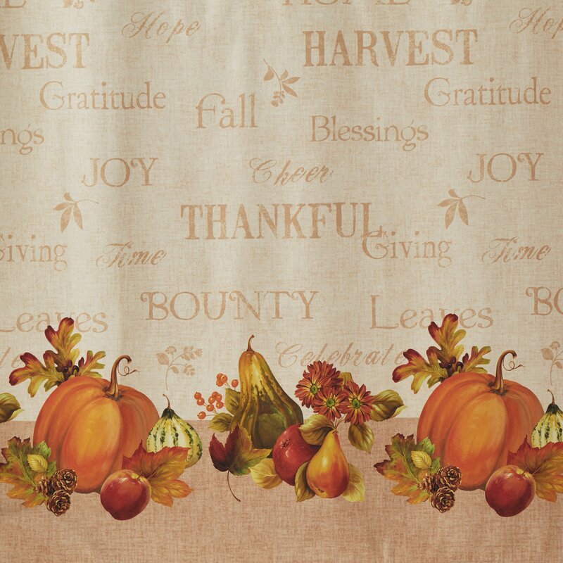 Decorate your bathroom for the fall season with this shower curtain from The Holiday Aisle. This lightweight fabric design features a harvest spread of pumpkins, fruits, and colorful leaves with inspirational/seasonal text.