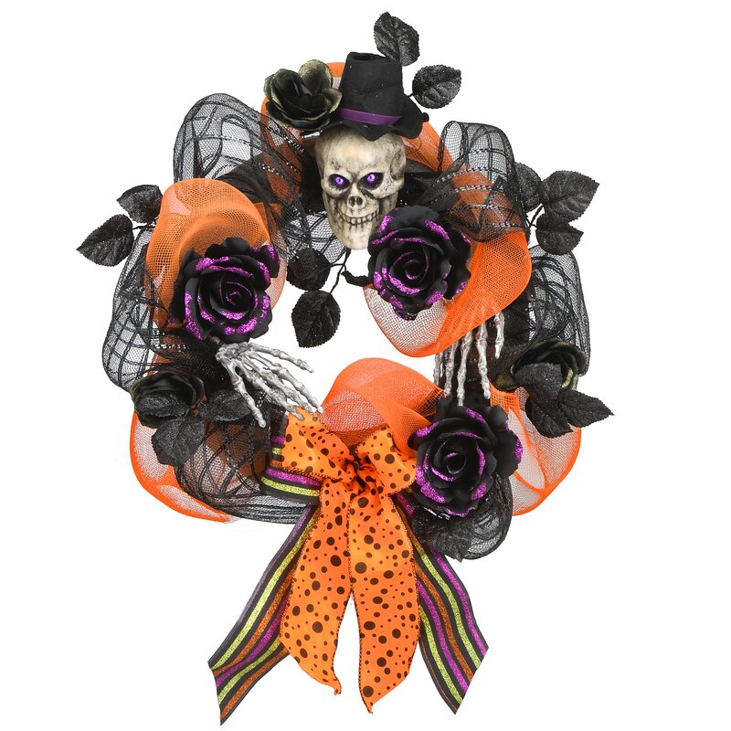 This Halloween decoration features coils of black and orange lace ribbon flowing from a foam ring backing. Additional trimming include a scary skull and bone hands, black rose blooms and leaves, and tied bows in polka-dot and striped patterns. Hang this ghoulish wreath on doors, walls and windows in indoor or covered outdoor locations.