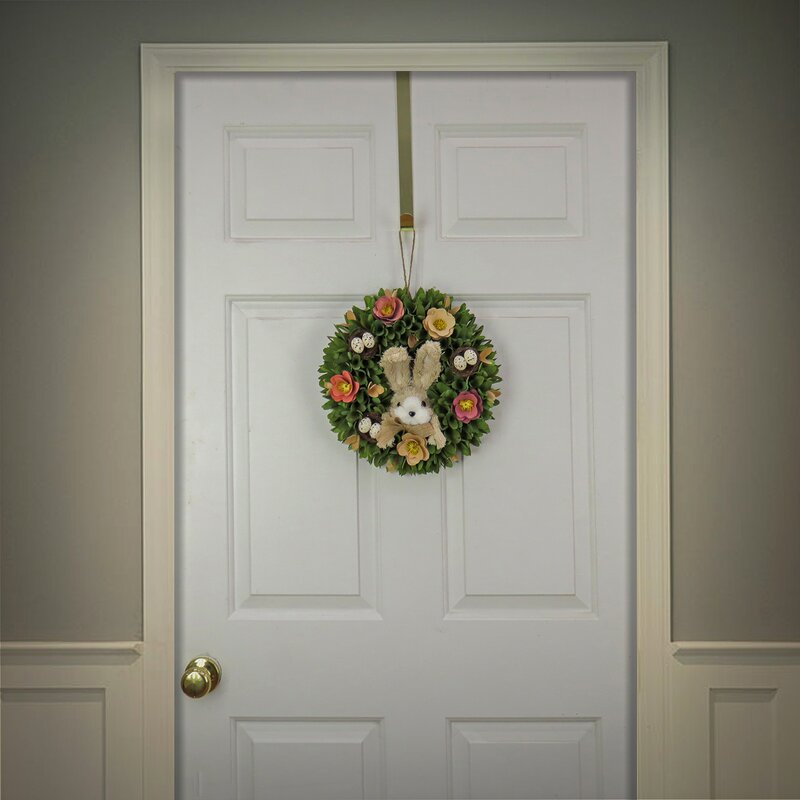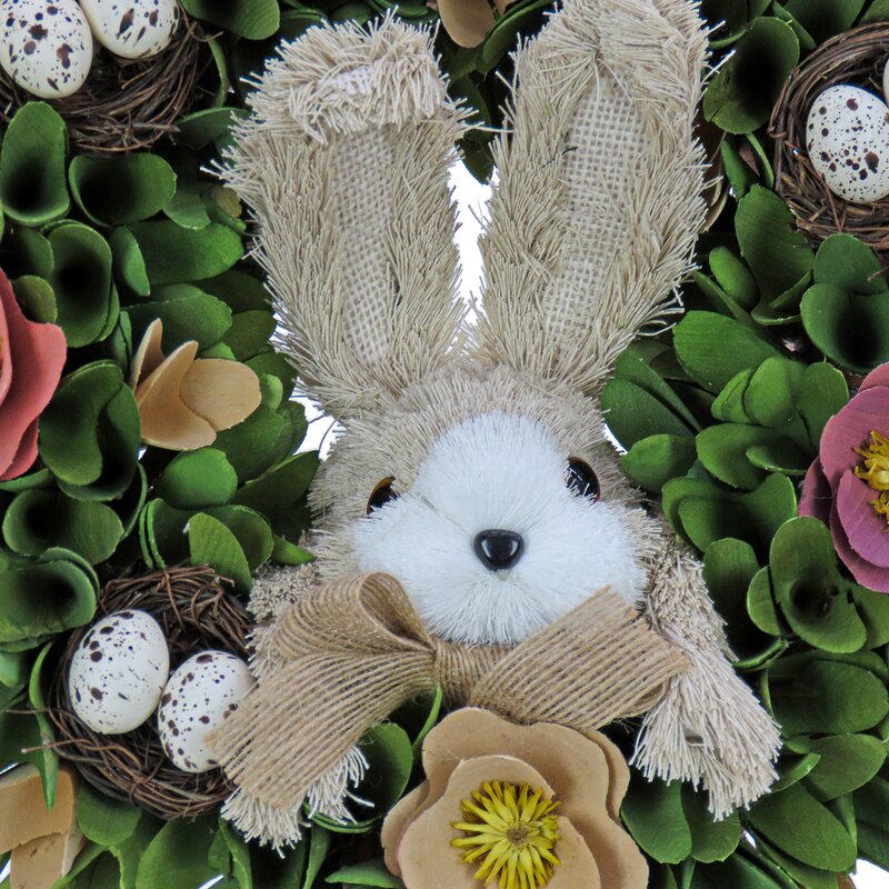 A long-eared bunny with a ribbon necktie occupies the wreath center. Display this fun Easter holiday trimming on doors, walls, or windows in indoor locations.