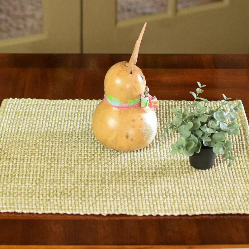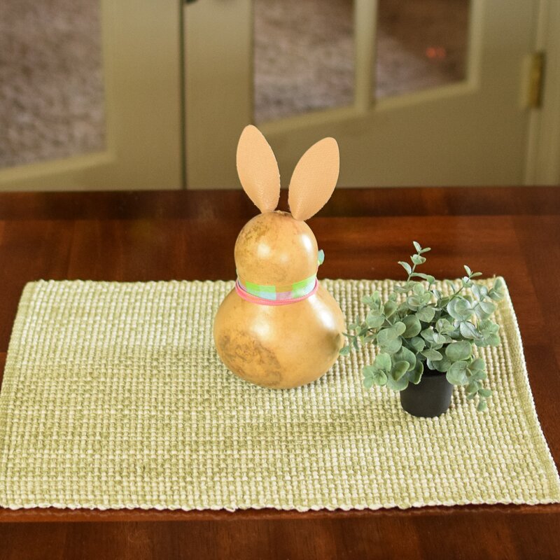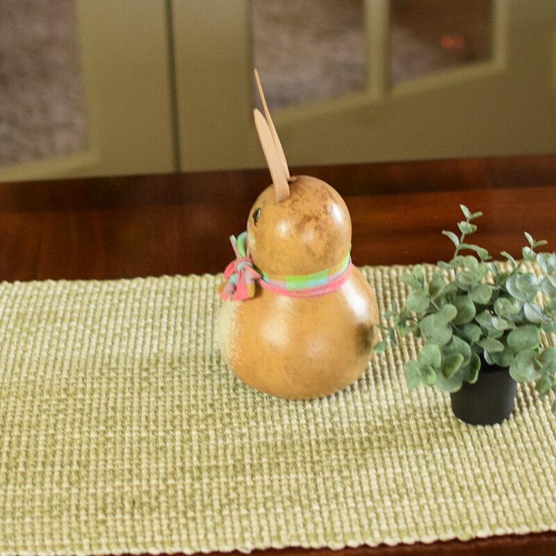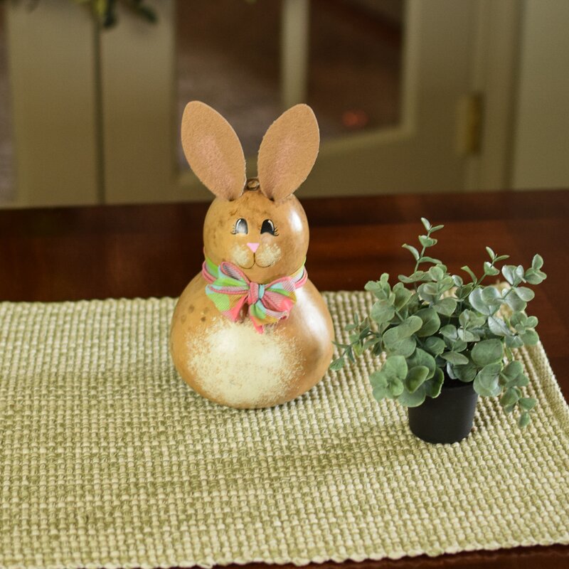 This hardshell gourd bunny is natural in color with a hand-sponged white belly and has a hand-painted face. She has a spring checkered bow. Because this design is crafted using natural gourds, each piece is ever so slightly different to make for a unique artisan piece.